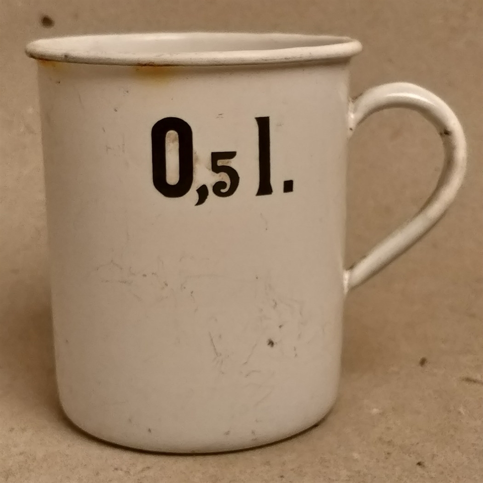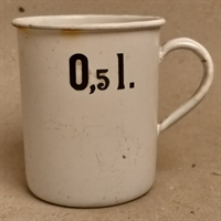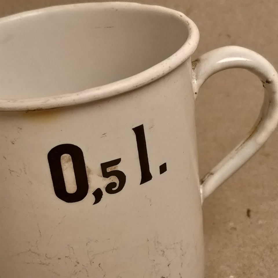 Opdag charmen ved traditionelle køkkenredskaber med vores "Emaljeret decilitermål, gammelt halvlitermål."