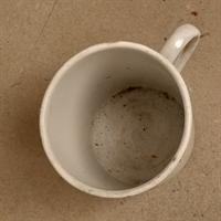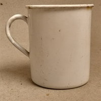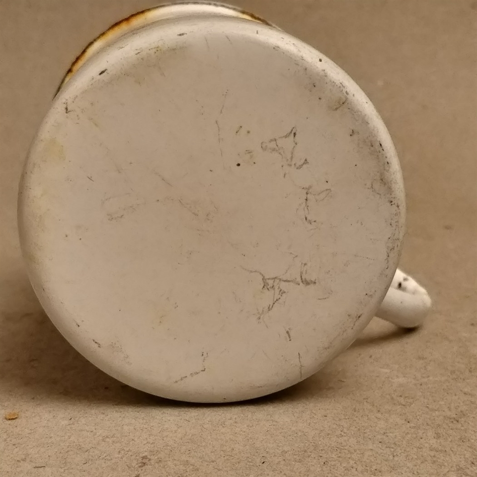Målet er fremstillet i emalje og prydet med sort tekst, der står i smuk kontrast til den klassiske hvide baggrund.