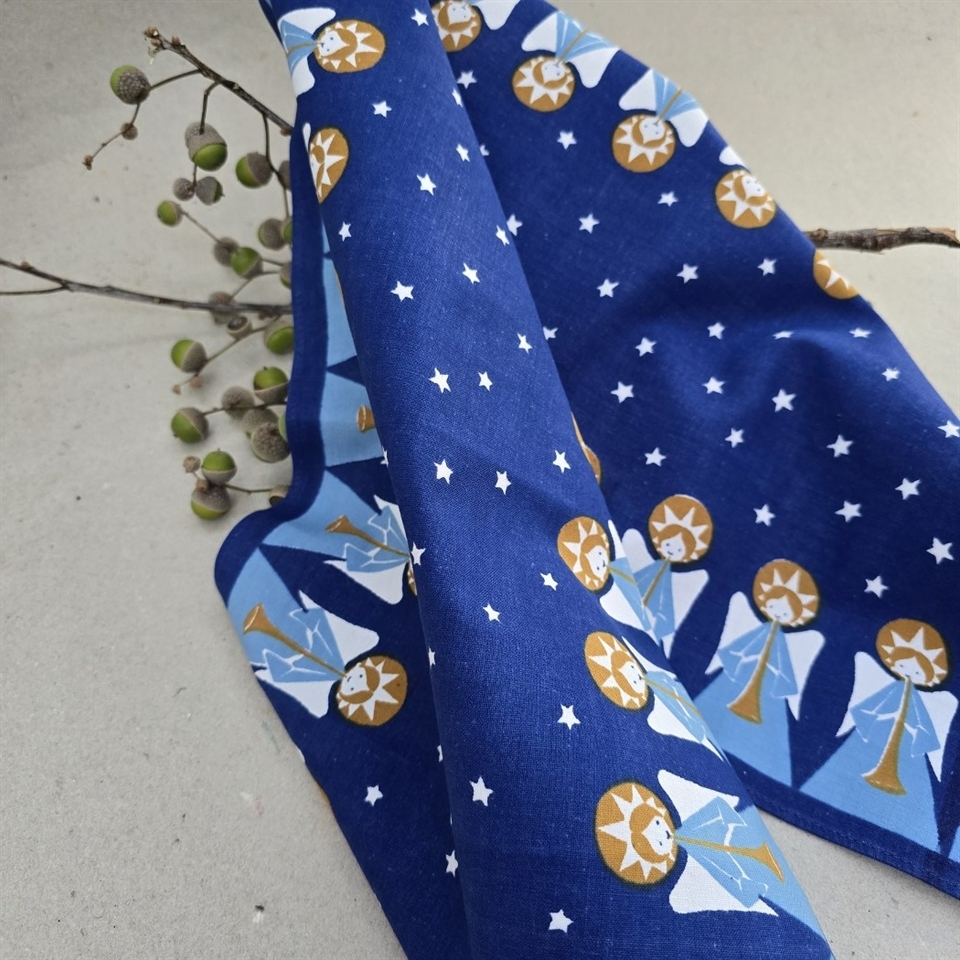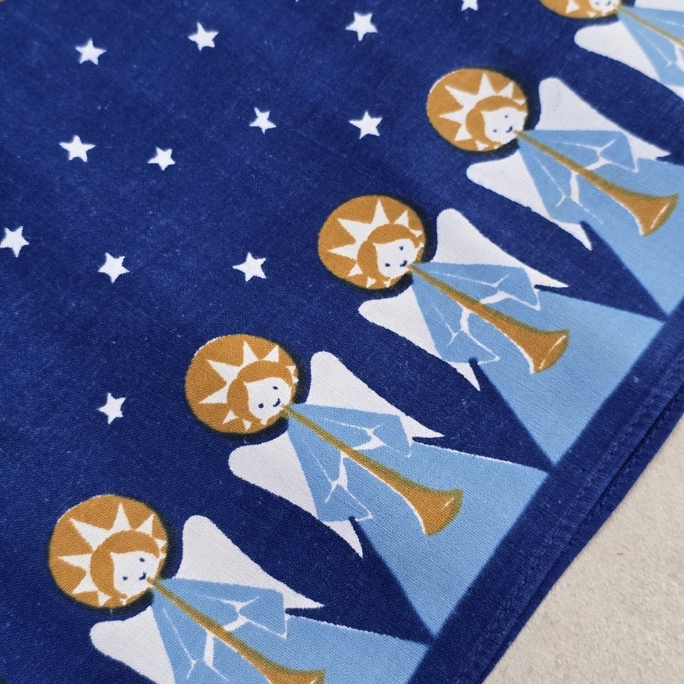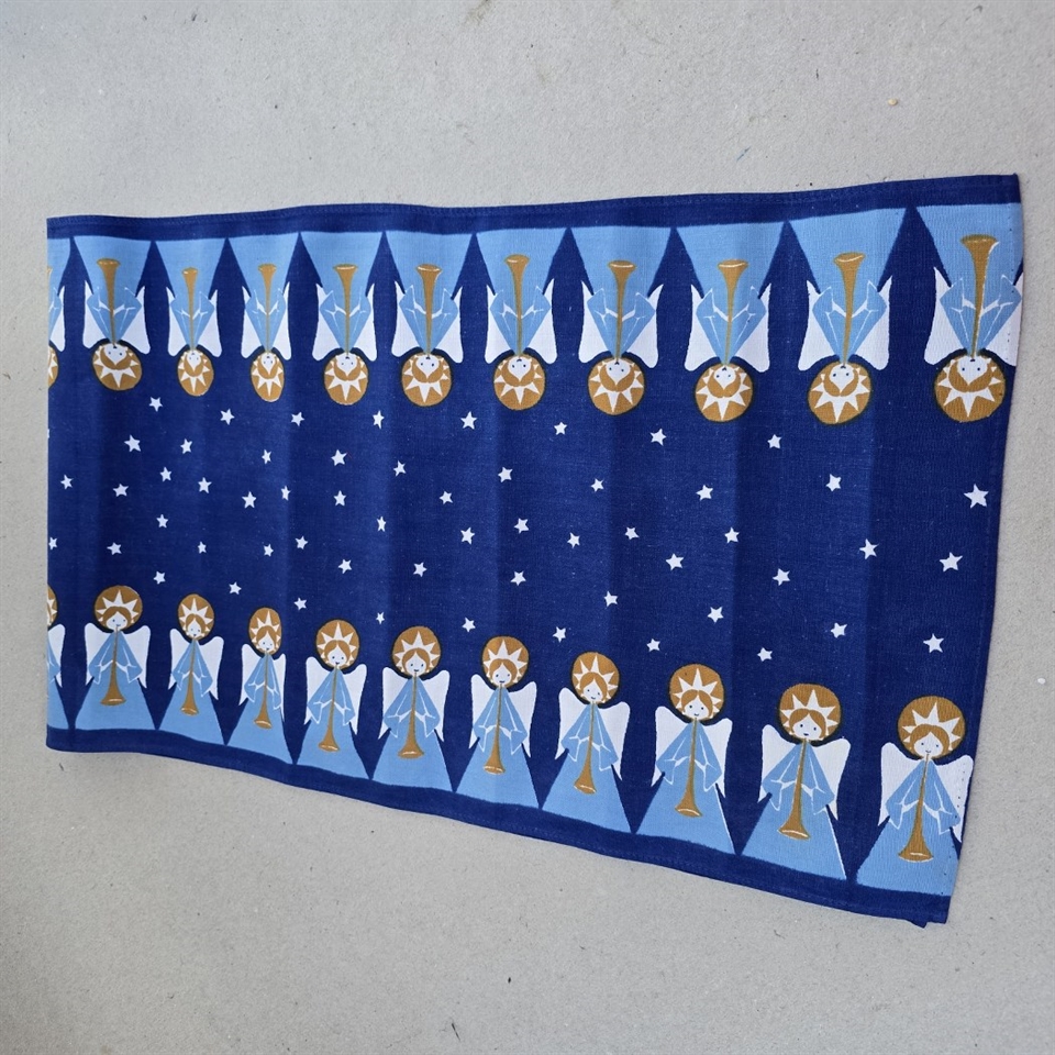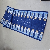 Størrelsen på 29 x 96 cm. gør den ideel til de fleste spiseborde eller kommoder, hvor den vil ligge og sprede julestemning med sin dybe, mørkeblå baggrund og livlige englemotiver.