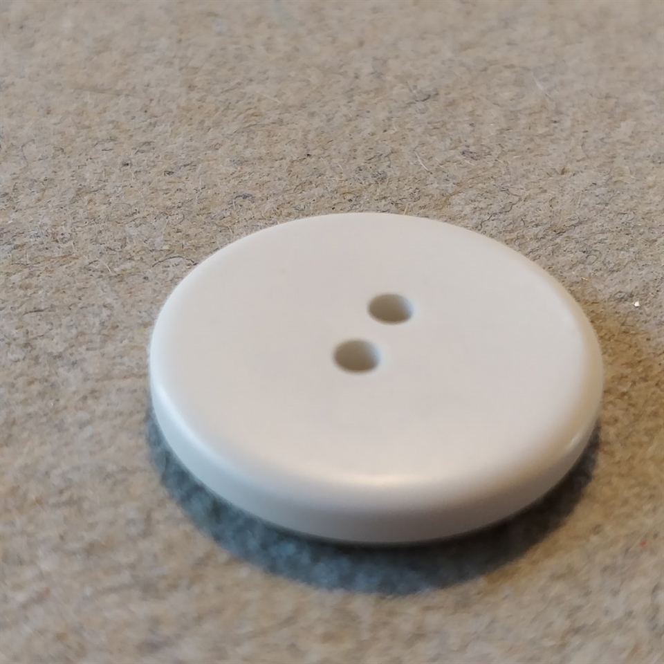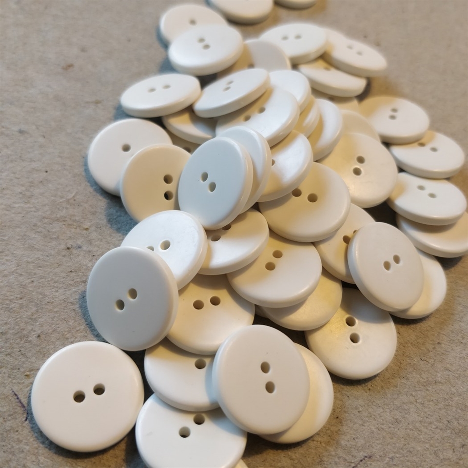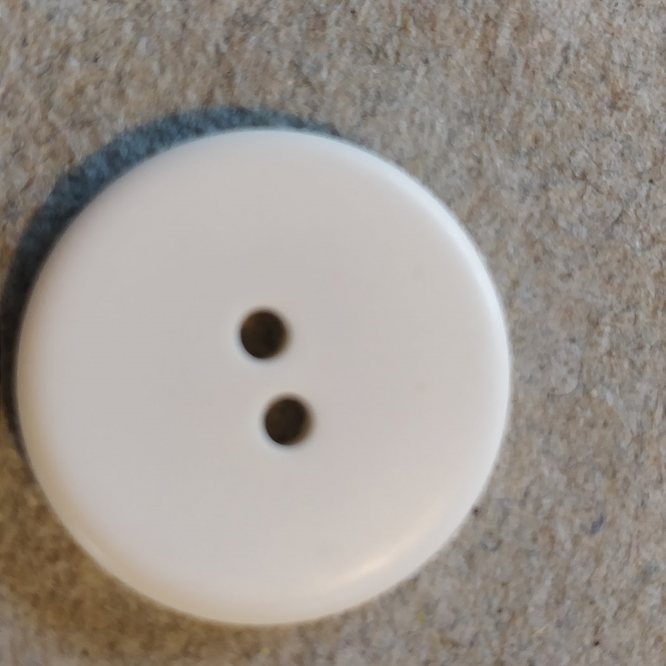 Denne klassiske knap er fremstillet af hvid plastik og har et tidløst design med to huller, hvilket gør den let at sy på enhver form for tøj eller tilbehør.
