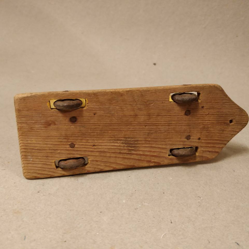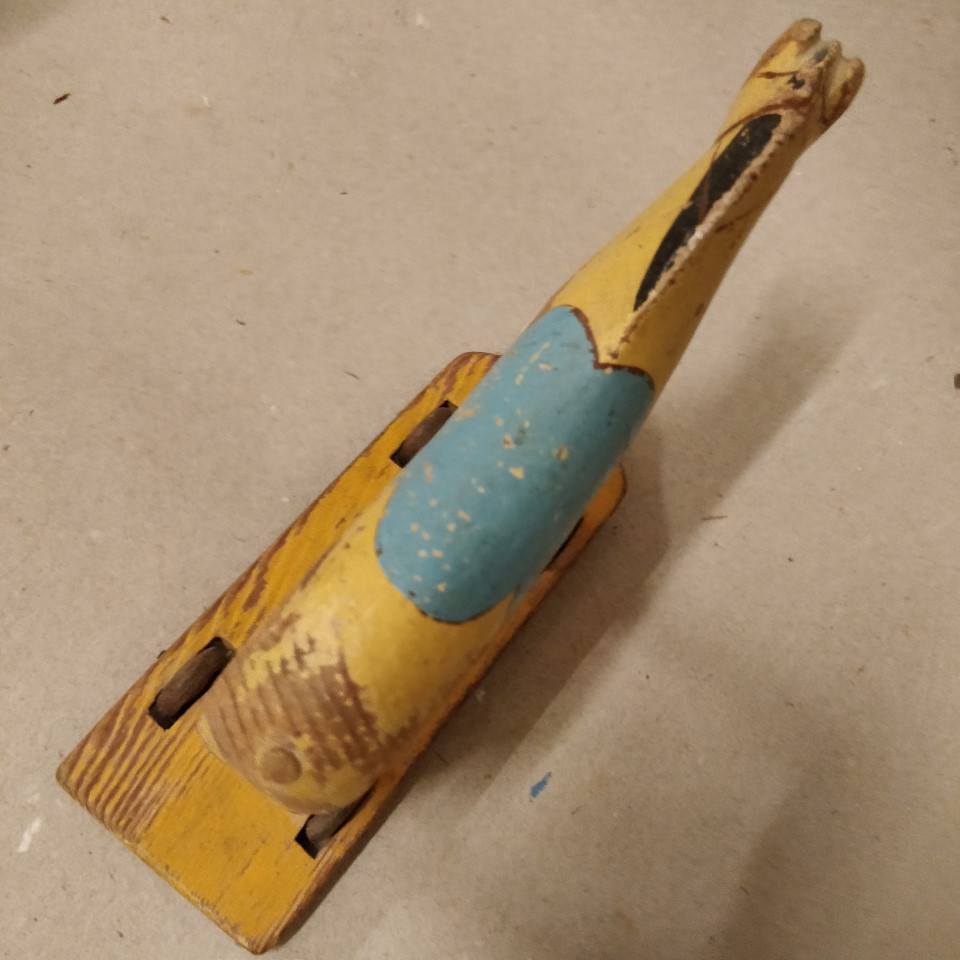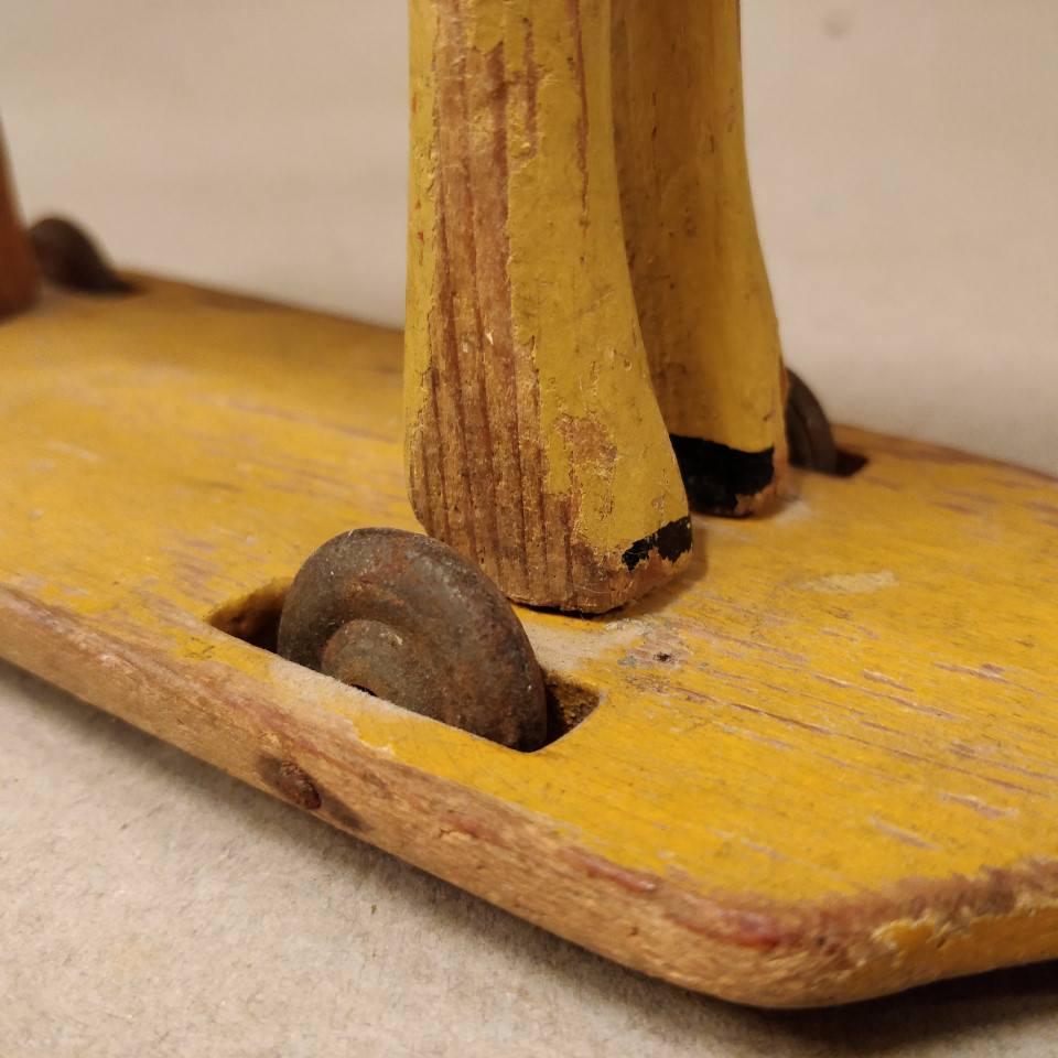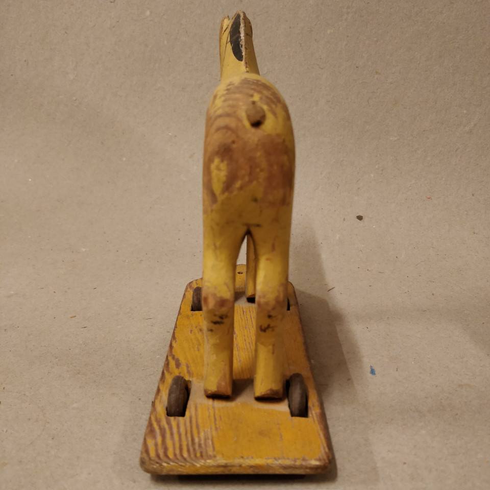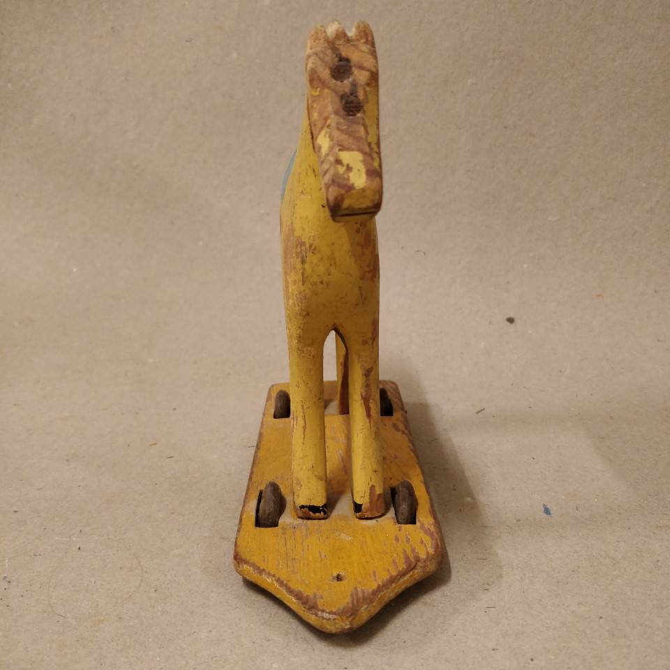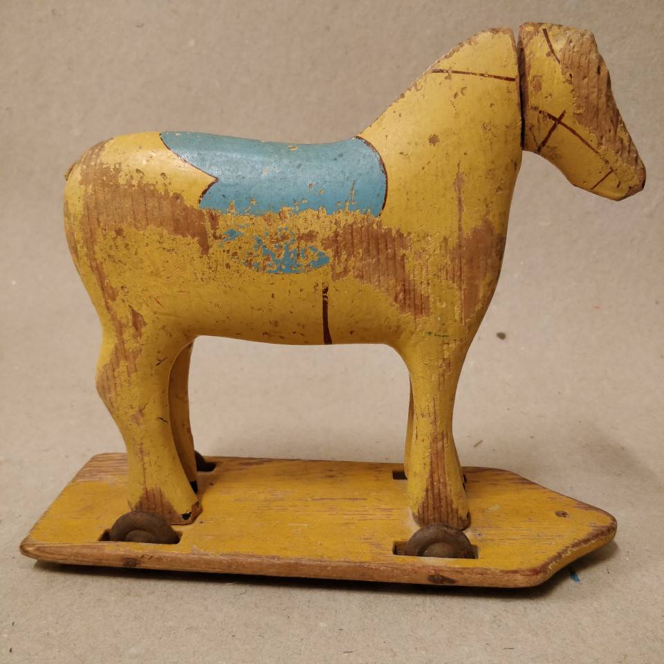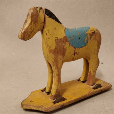 Fængselslegetøjs hest, på hjul, gul med blå sadel.