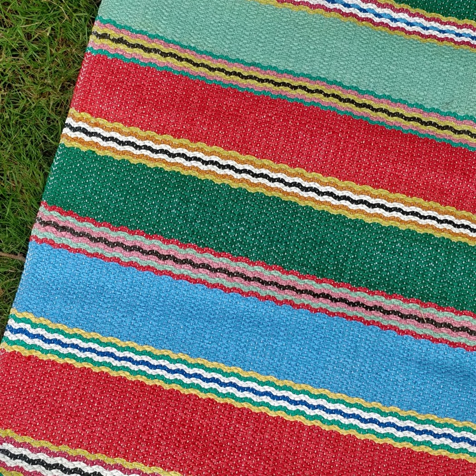 Med sine friske og klare striber i blå, grøn og rød, tilbyder tæppet en smuk måde at genbruge og integrere holdbart design i din boligindretning.