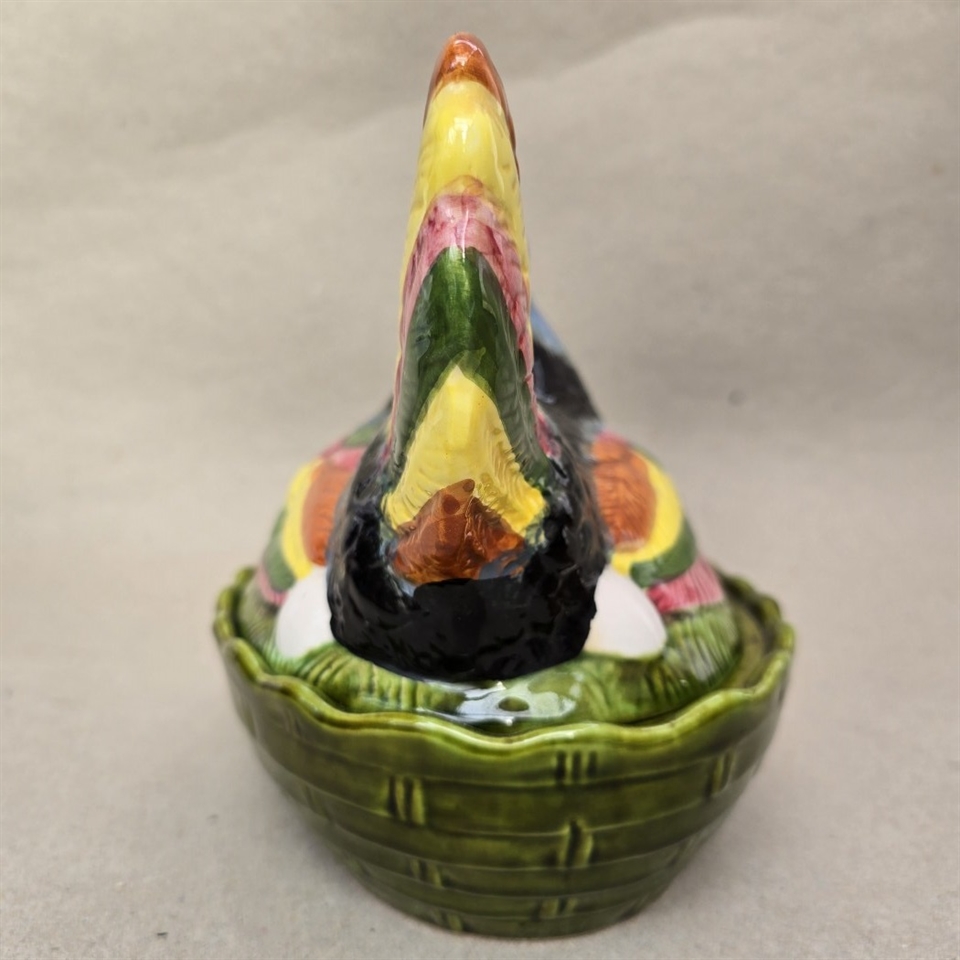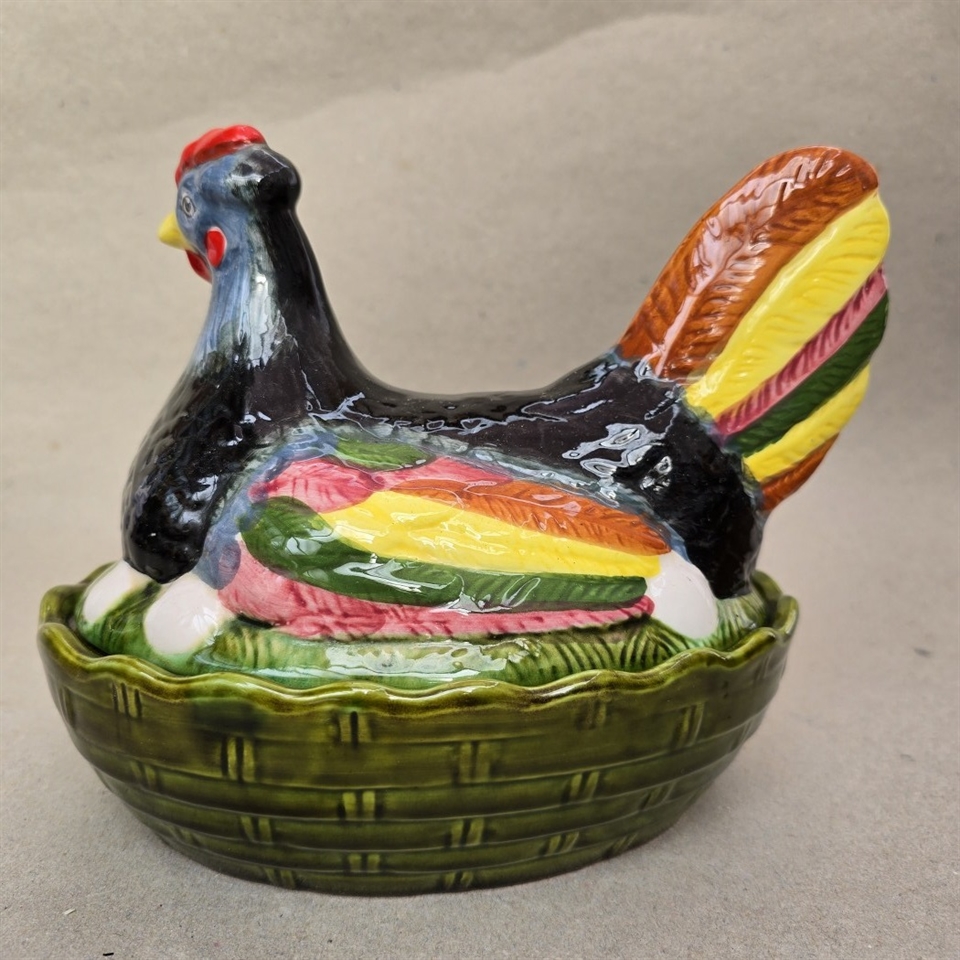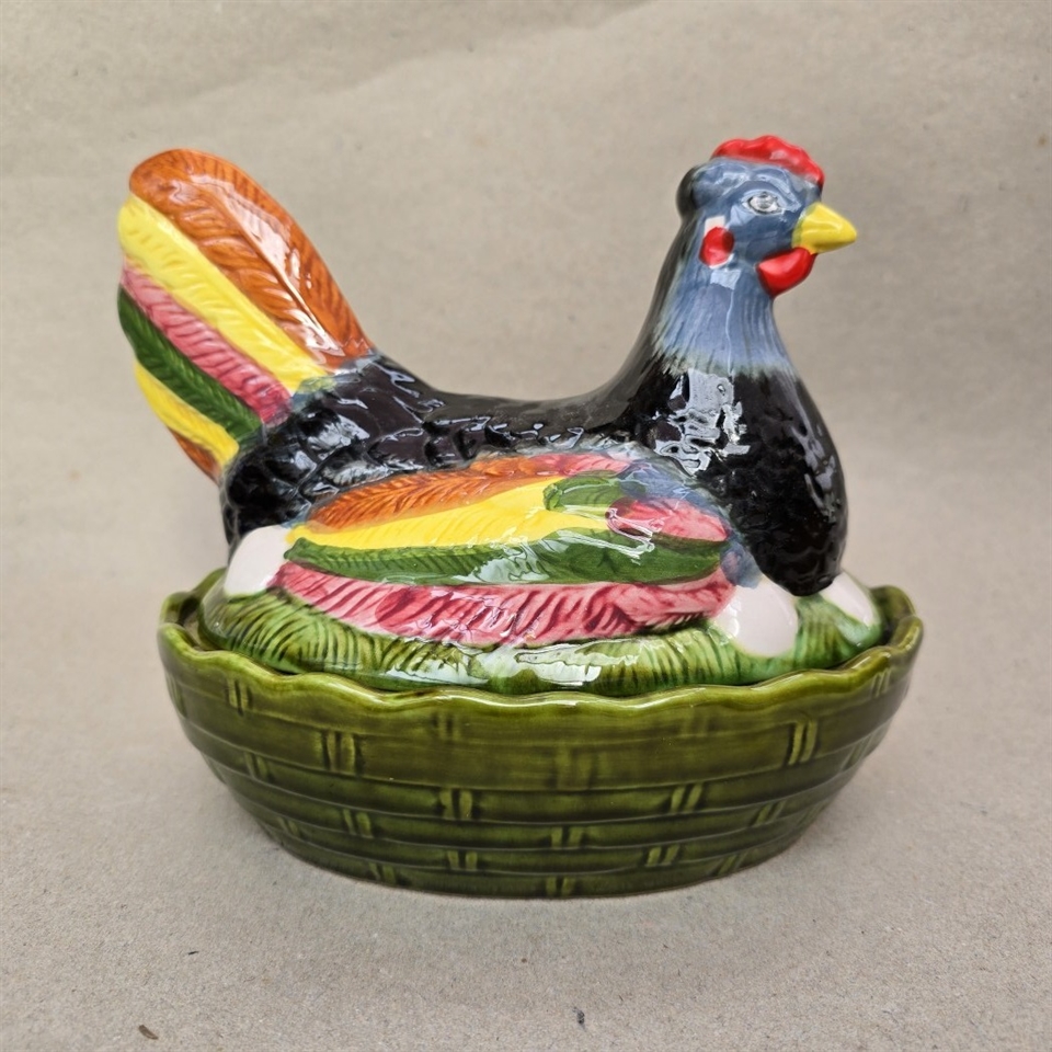 Opdag charmen og farverigdommen med vores 'Farverig retro porcelæns høne til at holde æggene varme'