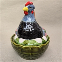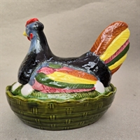 Vores porcelænshøne er 17,5 cm. høj og prydet med et levende, multifarvet design, der straks tilføjer varme og personlighed til dit hjem. Den er perfekt til at holde dine æg varme og lækre, mens du forbereder resten af morgenmaden, og den fungerer også som en charmerende samtalestarter.