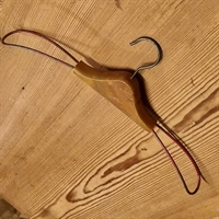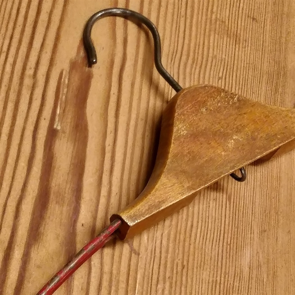 Denne unikke tøjbøjle kombinerer robust, rødt metal med naturligt træ, hvilket giver den et stilfuldt vintage look, der tilføjer karakter til din garderobe.