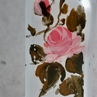 Den er omhyggeligt dekoreret med en håndmalet illustration af en lyserød rose komplet med grønne blade, hvilket giver den et livligt og farverigt udseende.