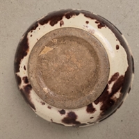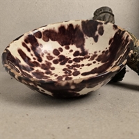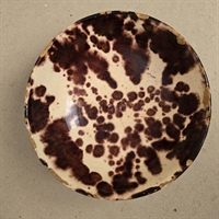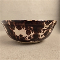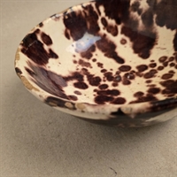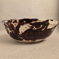 Denne unikke skål er fremstillet af keramik og prydes af en iøjnefaldende mørkebrun og creme meleret glasur, der tilføjer en varm og indbydende atmosfære til ethvert rum.