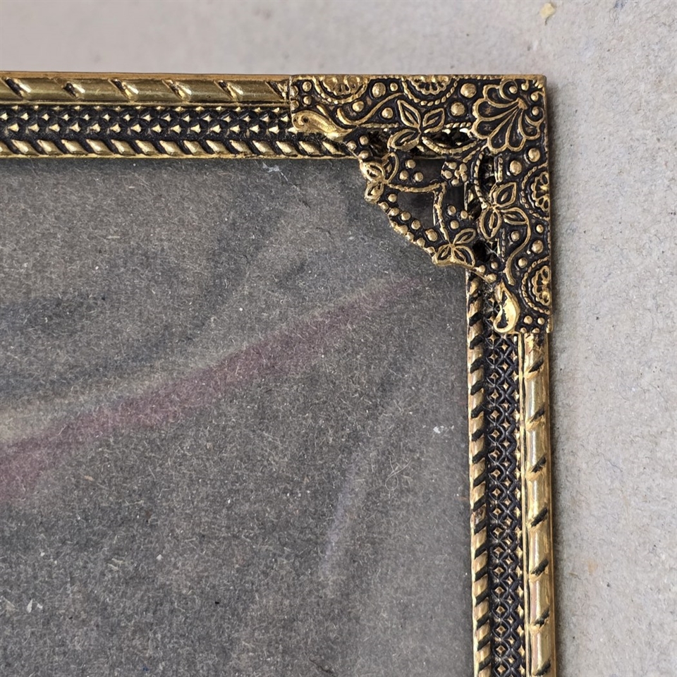 Rammen er fremstillet i messing, der har opnået en smuk patina over tid, hvilket tilføjer en varm, antik følelse til dit hjem.