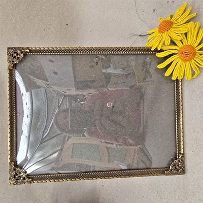 Opdag charmen ved vintage elegance med vores "Flotte hjørner på gammel messing fotoramme med buet glas". Denne smukke, rektangulære fotoramme er en ægte skat for enhver, der værdsætter tidløs skønhed og unikke detaljer.