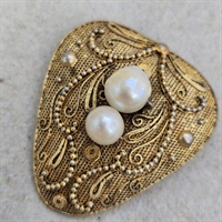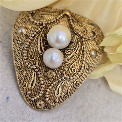 Oplev den udsøgte elegance og tidløse charme med vores "Forgyldt sølvbroche med 2 perler", et ægte mesterværk inden for vintage smykker.