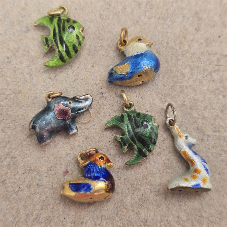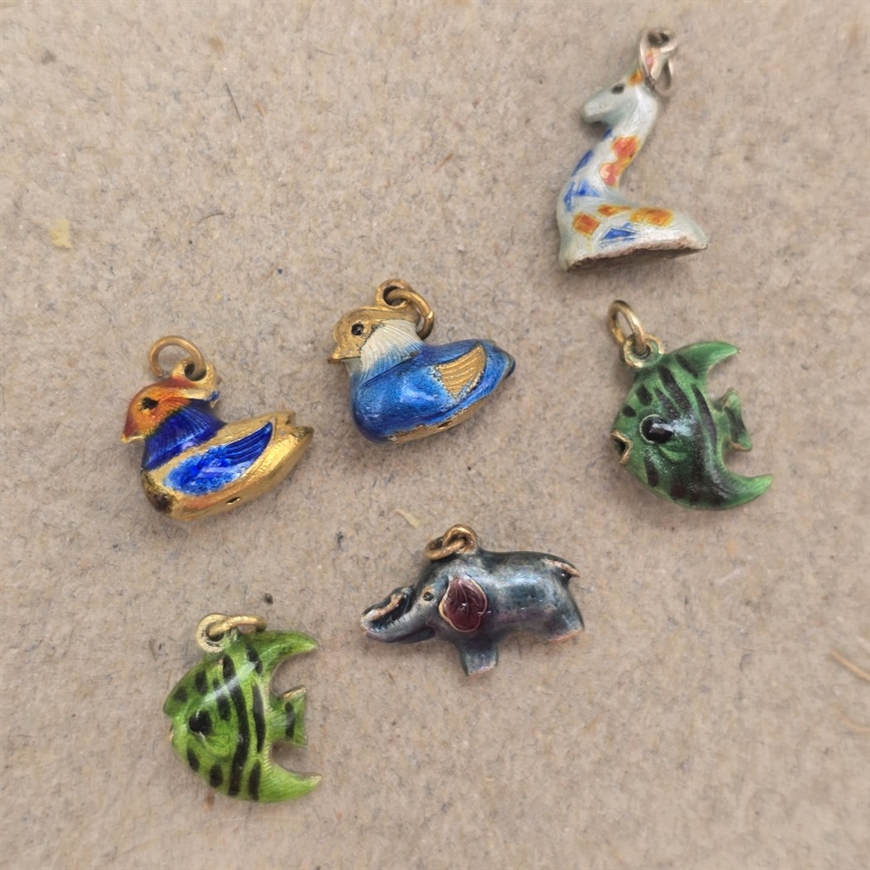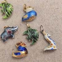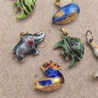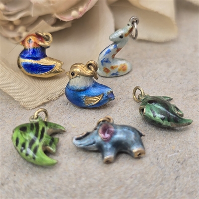 Hver charm er omhyggeligt emaljeret, hvilket giver en glansfuld og farverig finish, der fanger øjet. Disse sølvvedhæng er reproduktioner af gamle tyske charms, og de oser af vintage-charme og håndværksmæssig finesse.