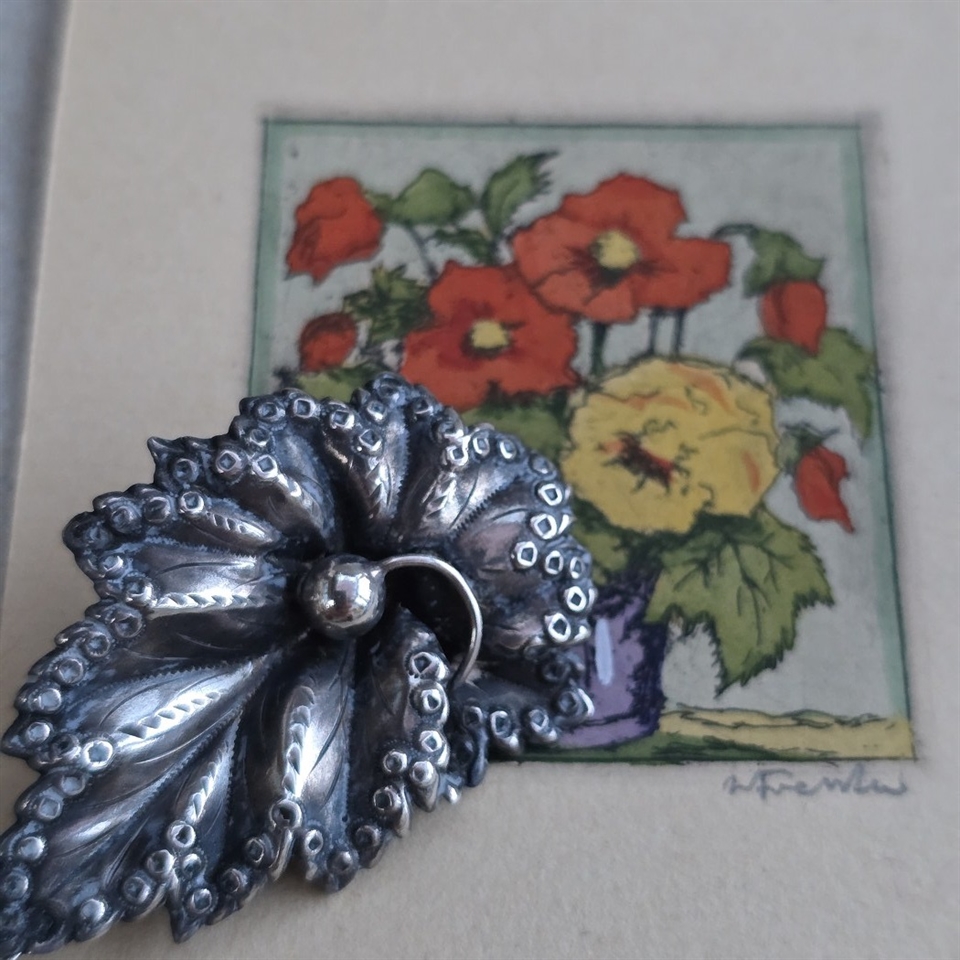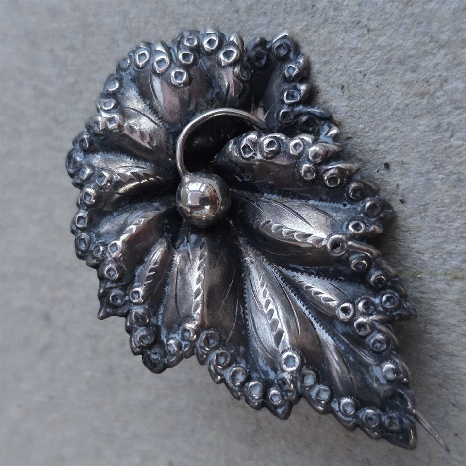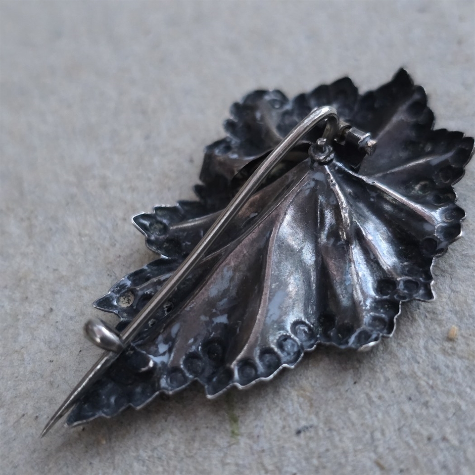 Oplev den tidløse elegance med vores 'Forsølvet bladbroche, vintage broche med smuk kant'. Dette forfinede smykke er en hyldest til klassisk skønhed og sofistikerede detaljer.