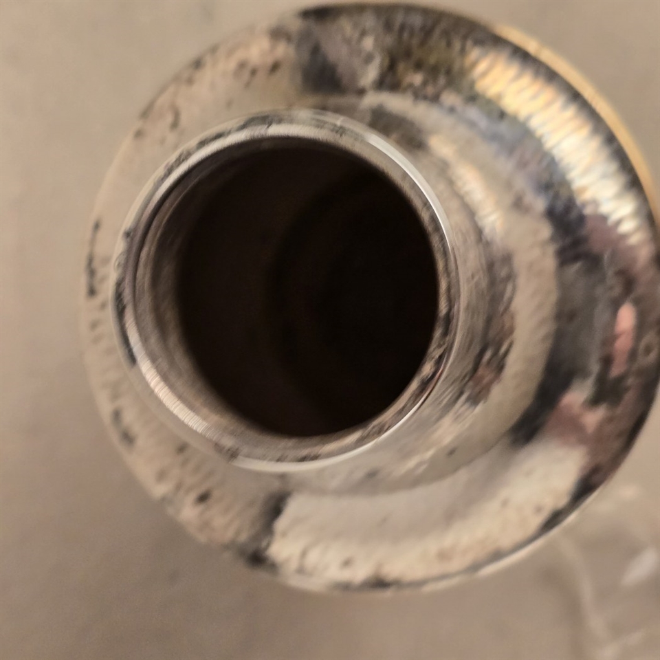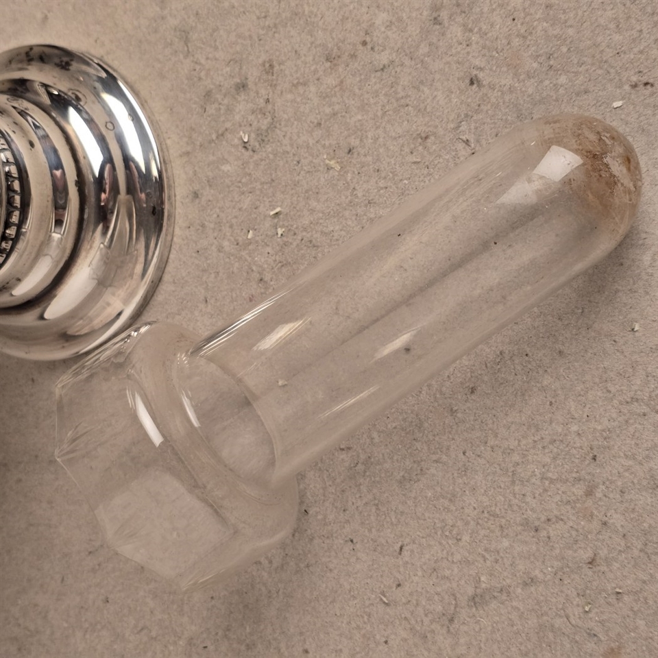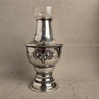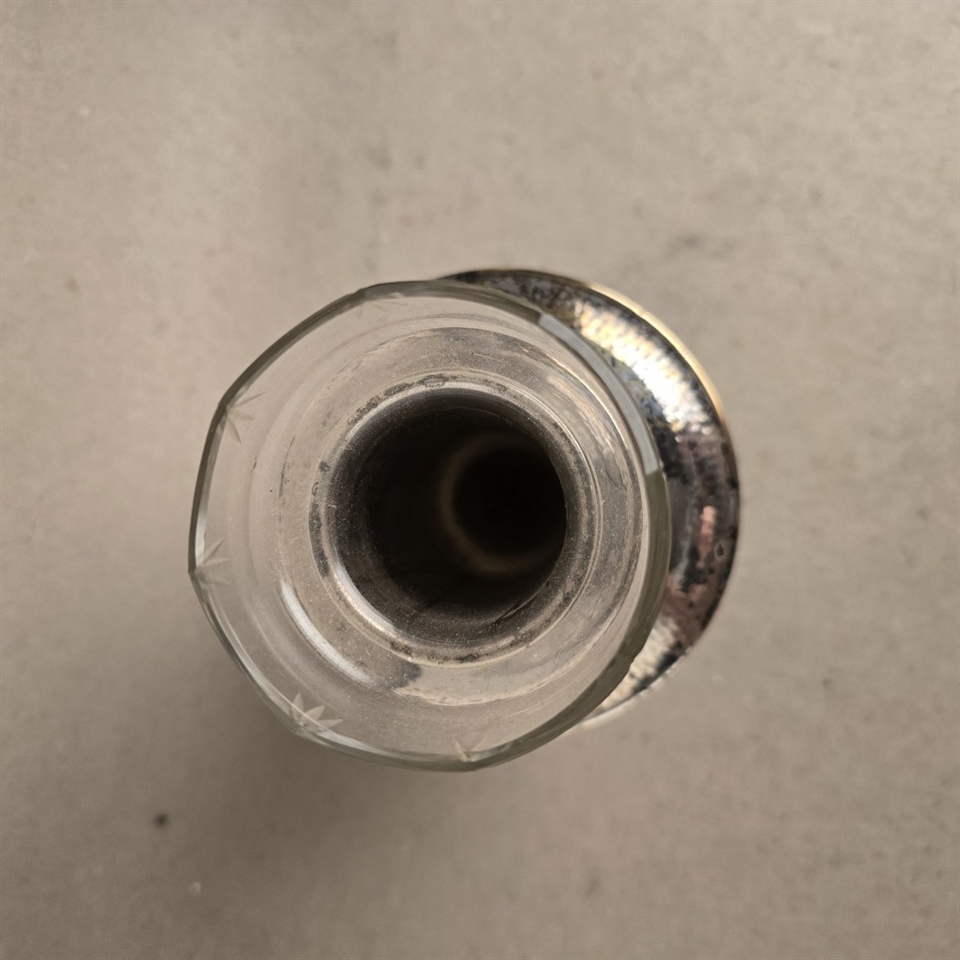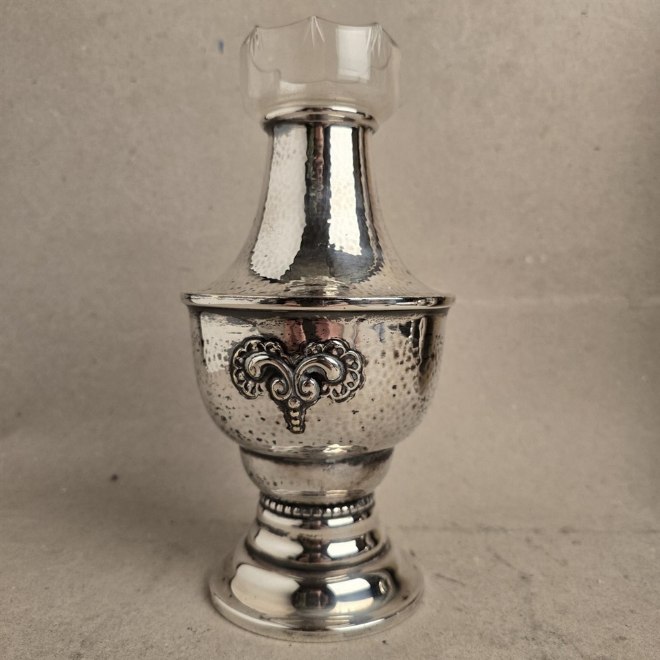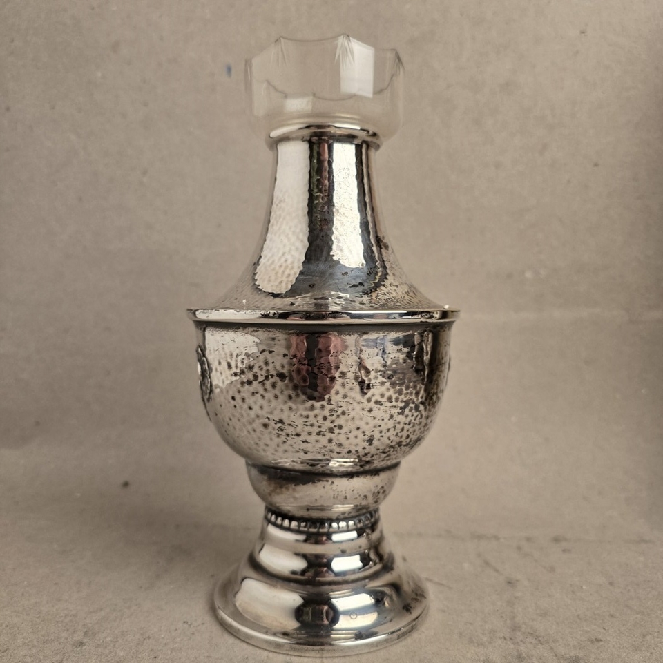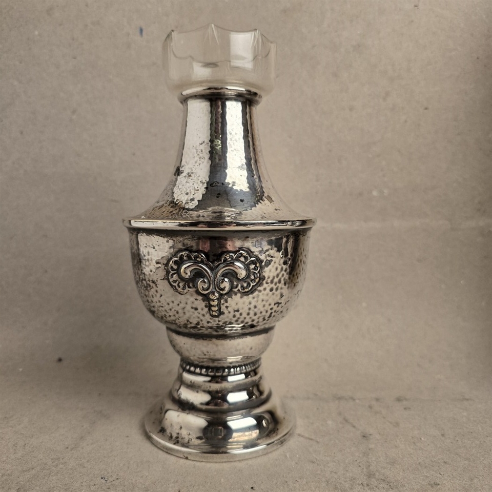 Opdag den ædle elegance med vores "Forsølvet stor gammel vase med glas indsats", en sand perle til enhver indretning, der værdsætter tidløs skønhed og raffinement.