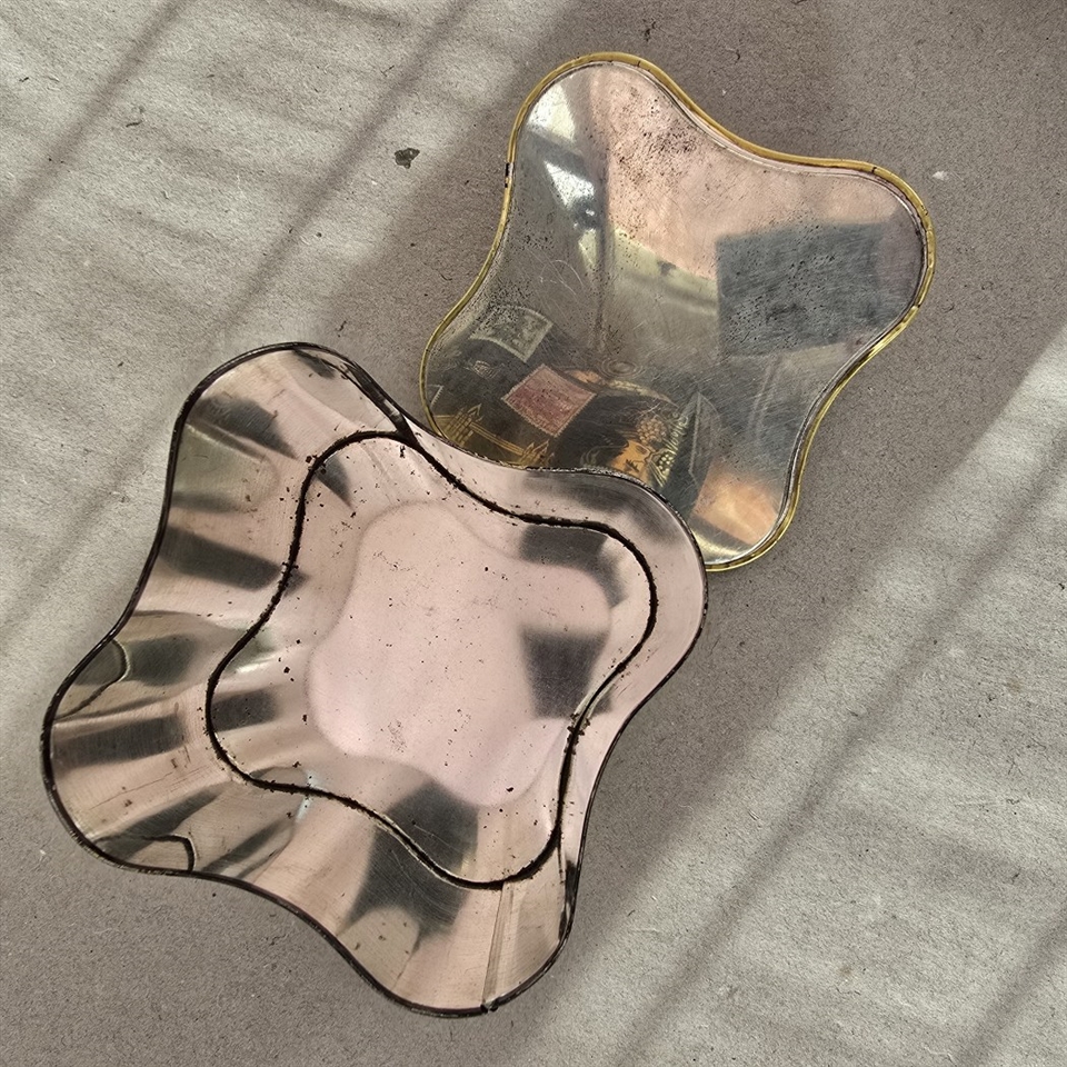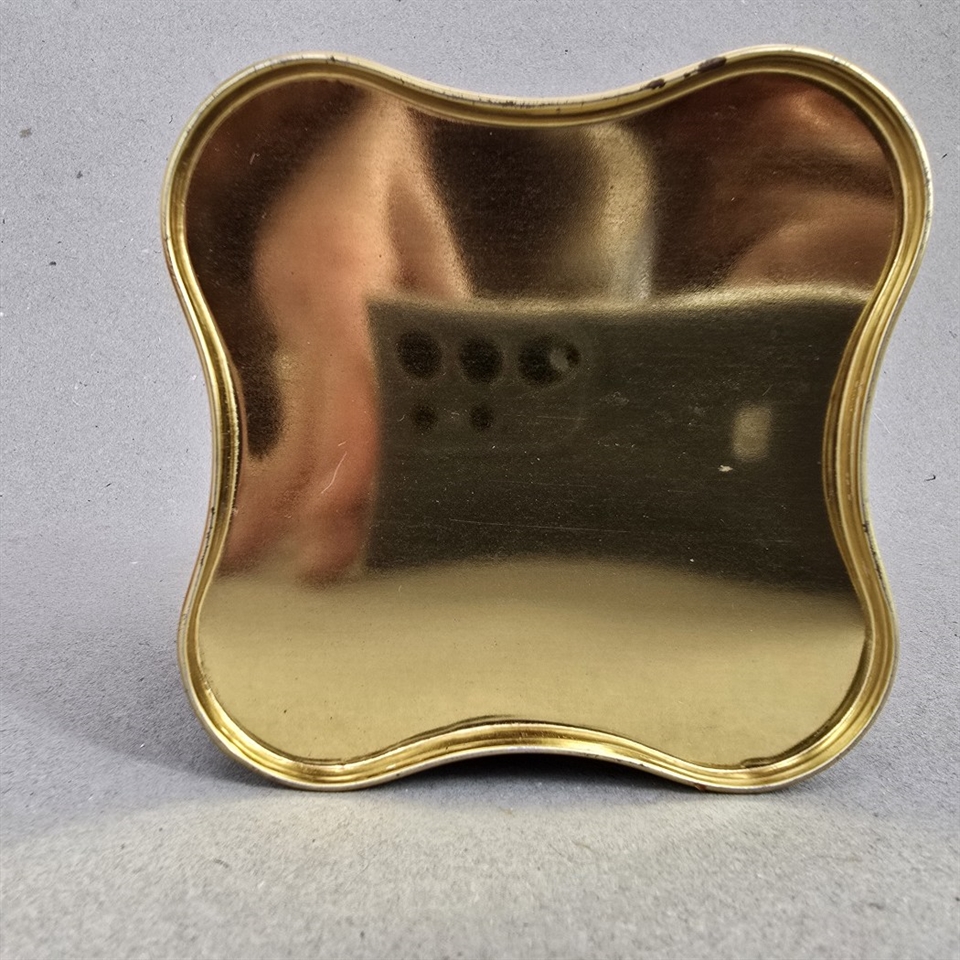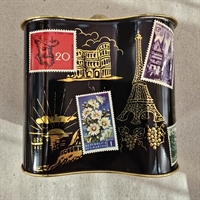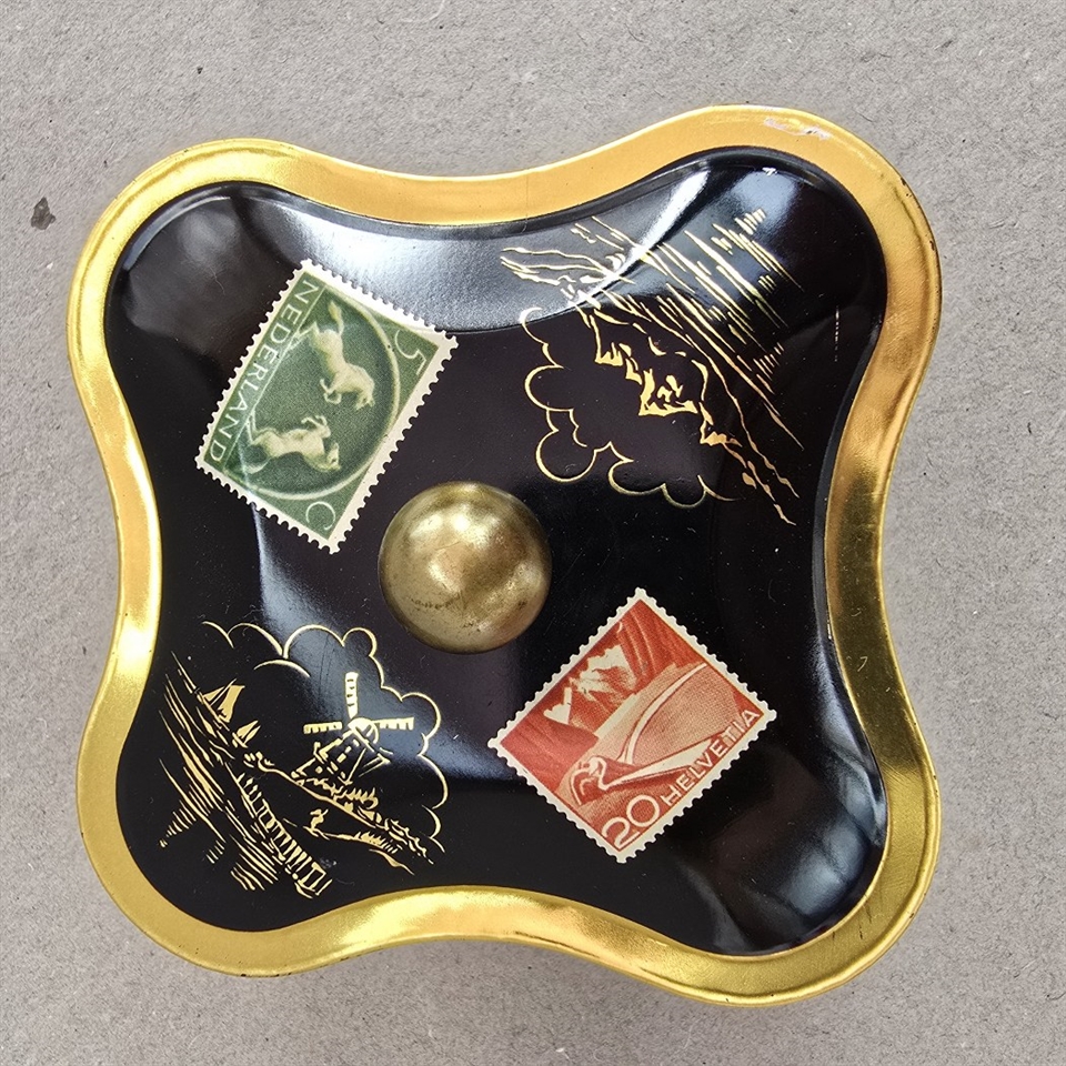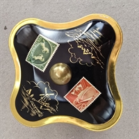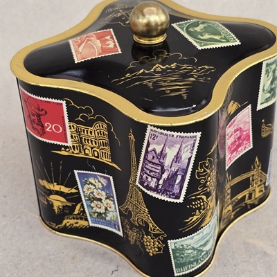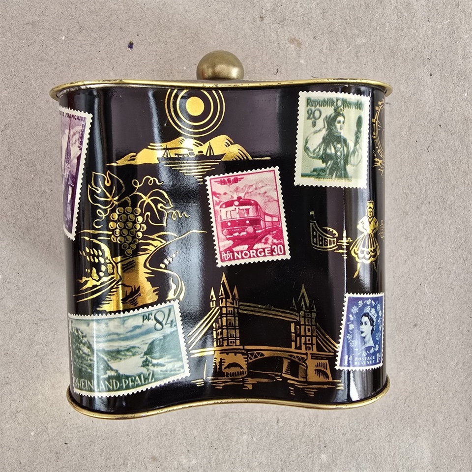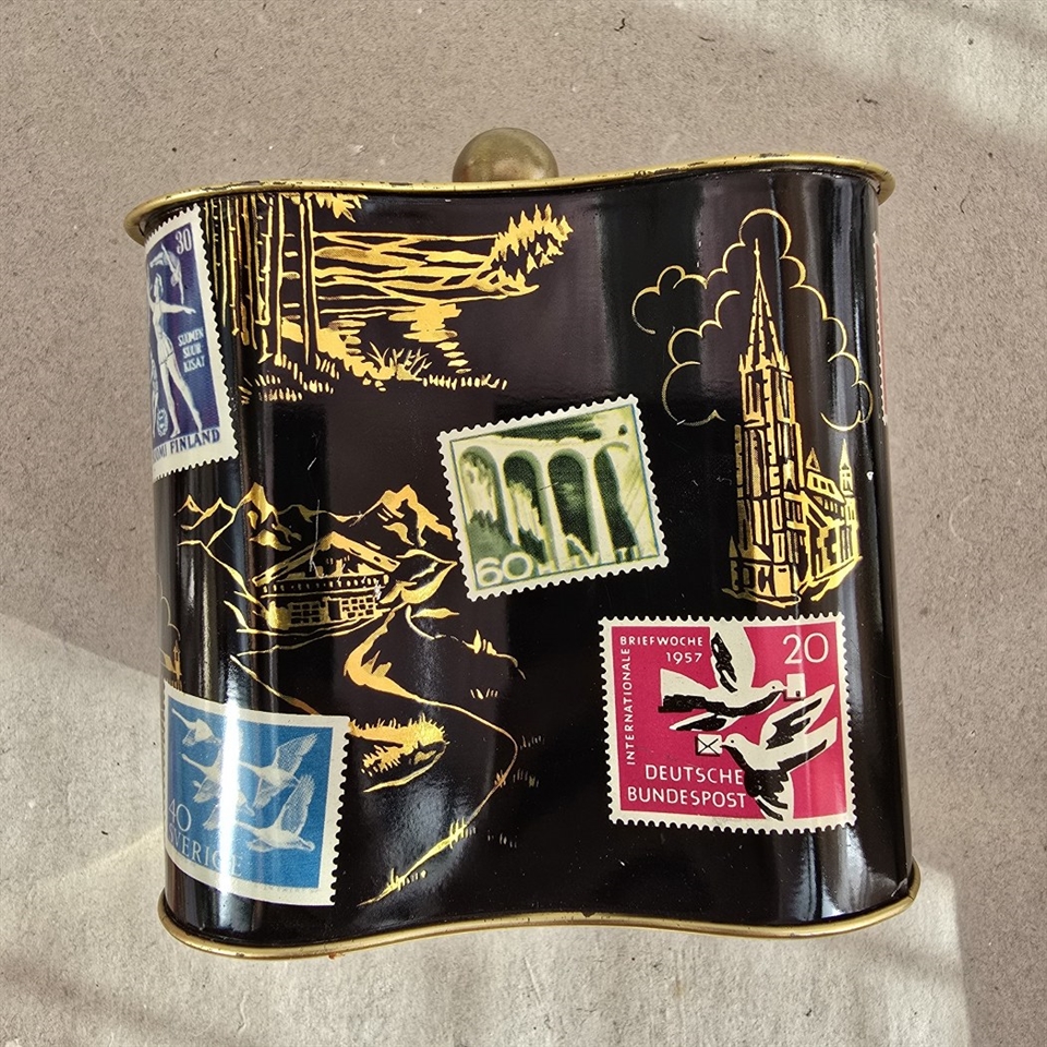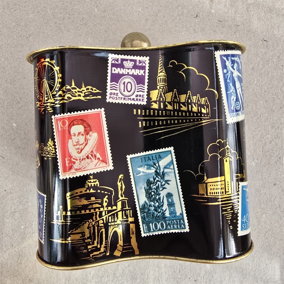Denne smukt designede kagedåse, med sine karakteristiske firkantede buede hjørner og et stilfuldt sort låg, er prydet med et iøjnefaldende frimærkemotiv, der tilføjer et antikt og samtidig moderne touch til enhver indretning.