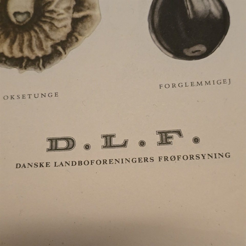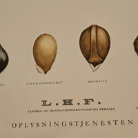 Frøtavler fra oplysningstjenesten, for D.L.F. Danske landboforeningers frøforsyning, L.H.F. Landbo- og husmandsforeningernes frøsalg, F.D.B. Fællesforeningen for Danmarks brugsforeninger.