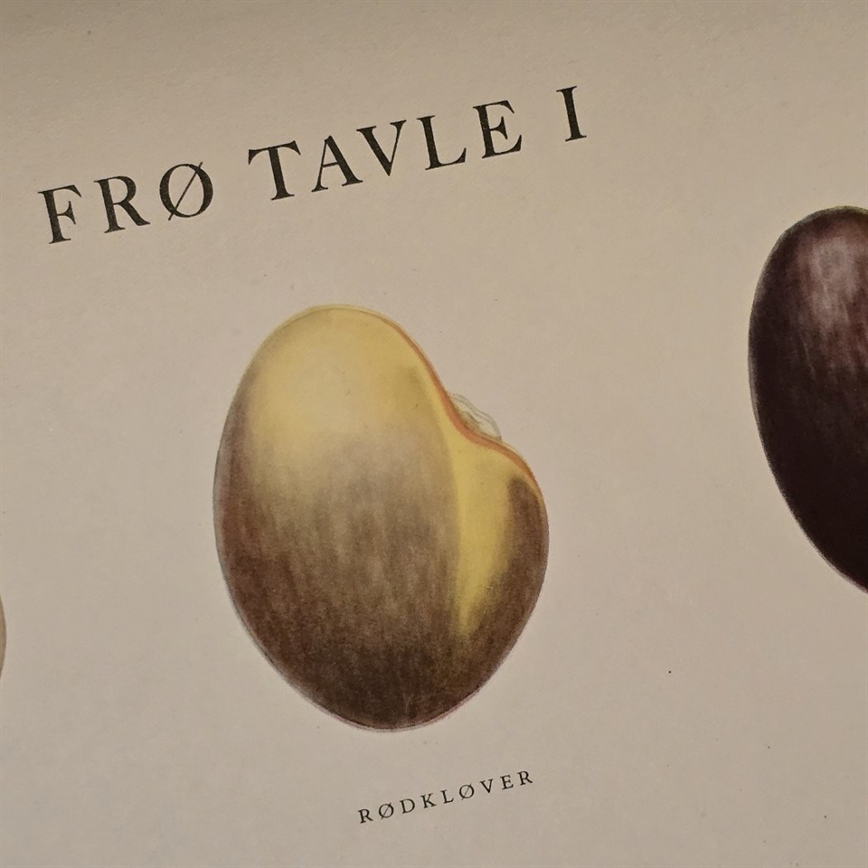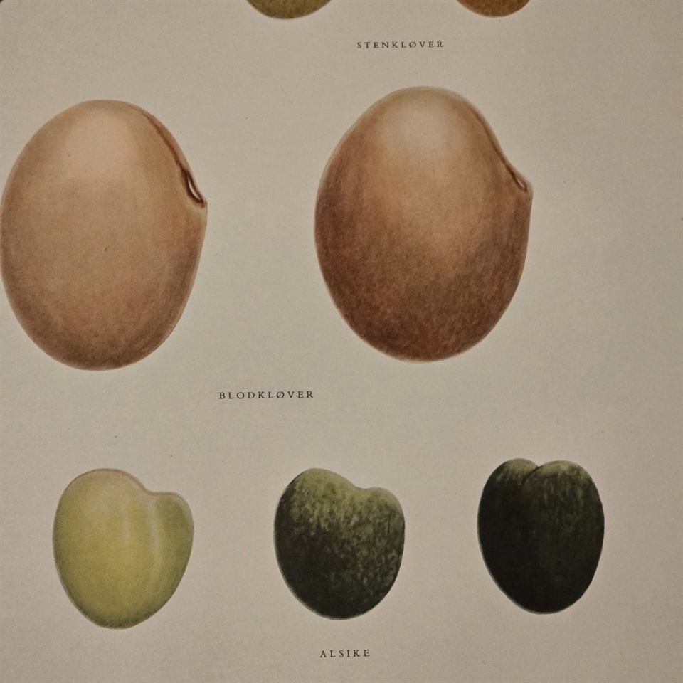 Tavlen viser detaljerede og farverige tegninger af frø fra rødkløver, gul rundbælg, blodkløver, ++ som er nøje udvalgt og præsenteret.