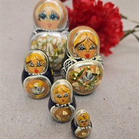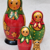Rød, pink trædukker, gamle russiske dukker. 5 stk.