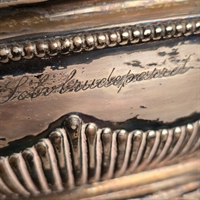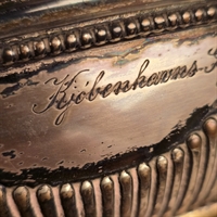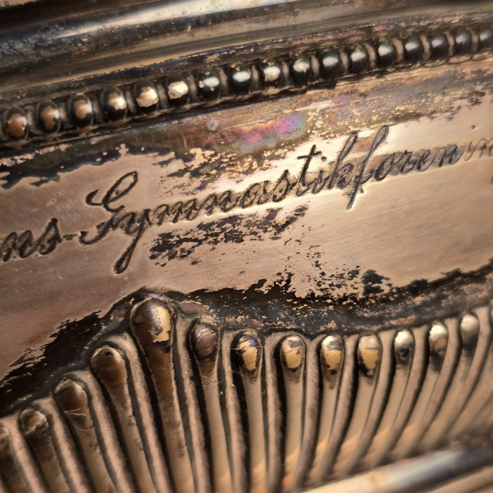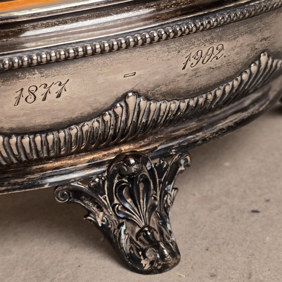 Dimensionerne på denne prægtige skål er generøse - 38 cm. i længden, 24,5 cm. i bredden og 15 cm. i højden, hvilket gør den til en imponerende tilføjelse til ethvert rum. Den bærer på en rig historie, som er indgraveret med en inskription fra perioden 1887-1902, hvilket tilføjer en unik historisk dybde og samtaleværdi.