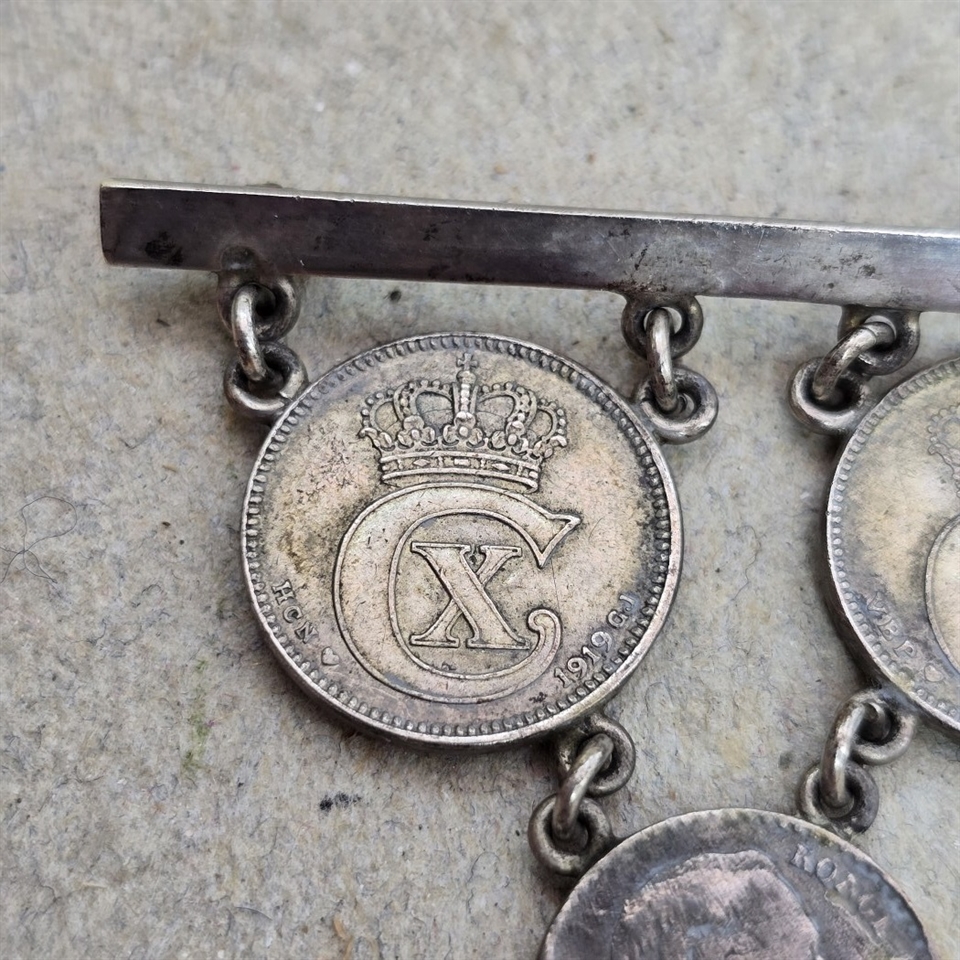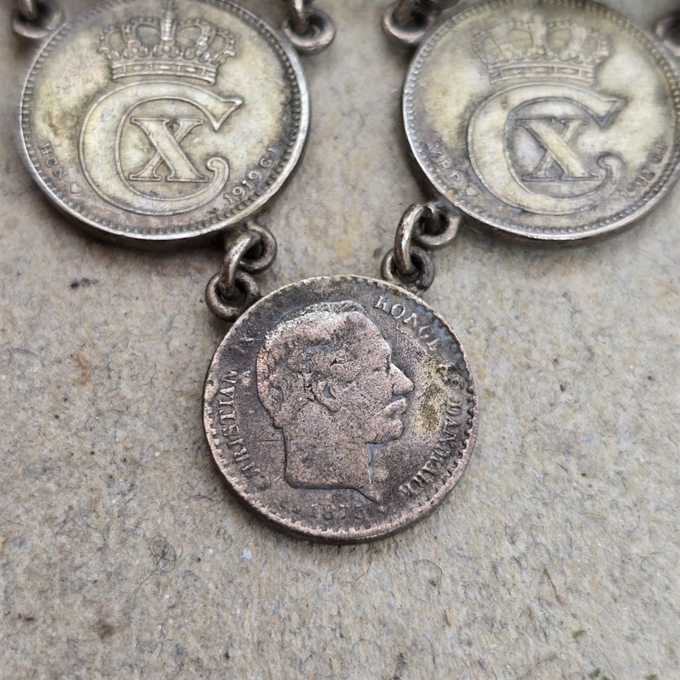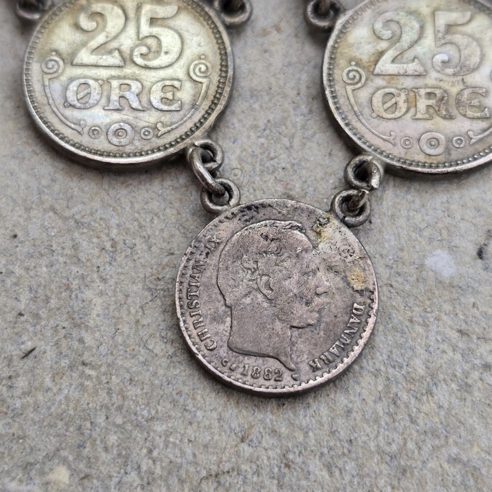 Dette unikke smykke er en hyldest til den rige danske historie og kongelig arv, repræsenteret ved 25 øre mønter fra regeringstiden af Kong Christian den Tiende.