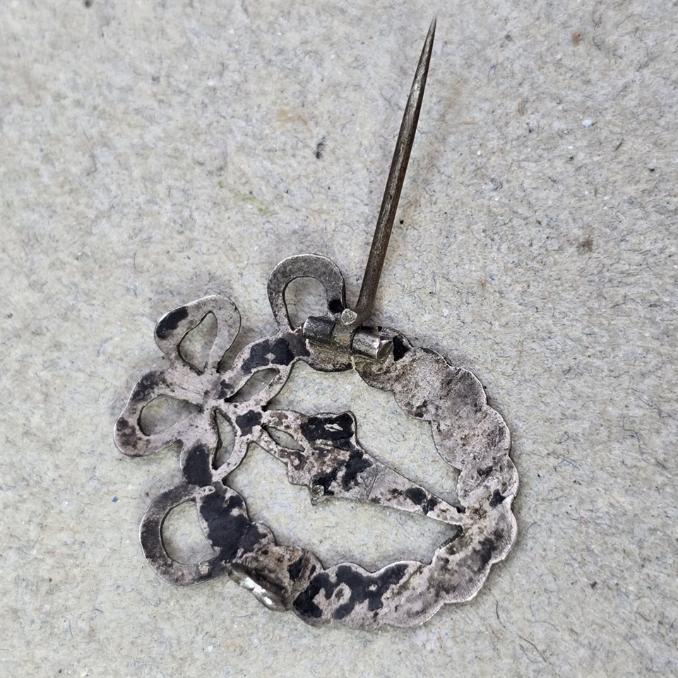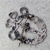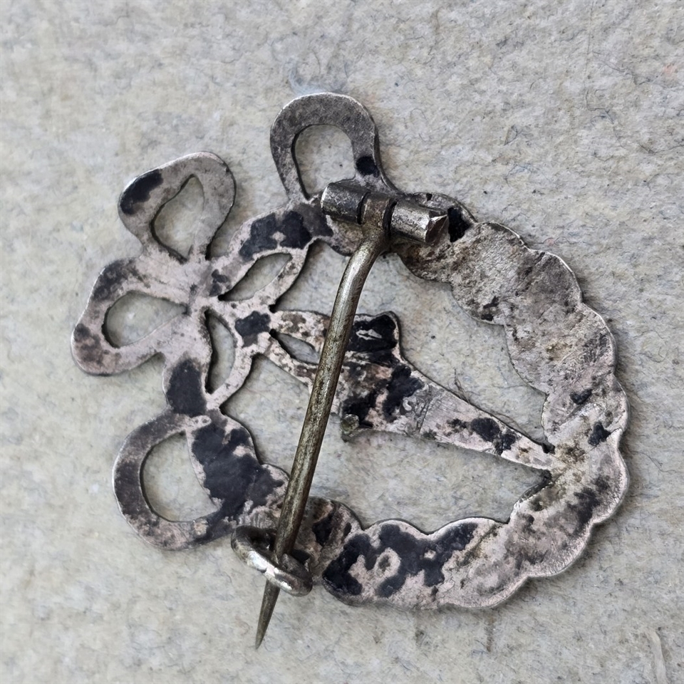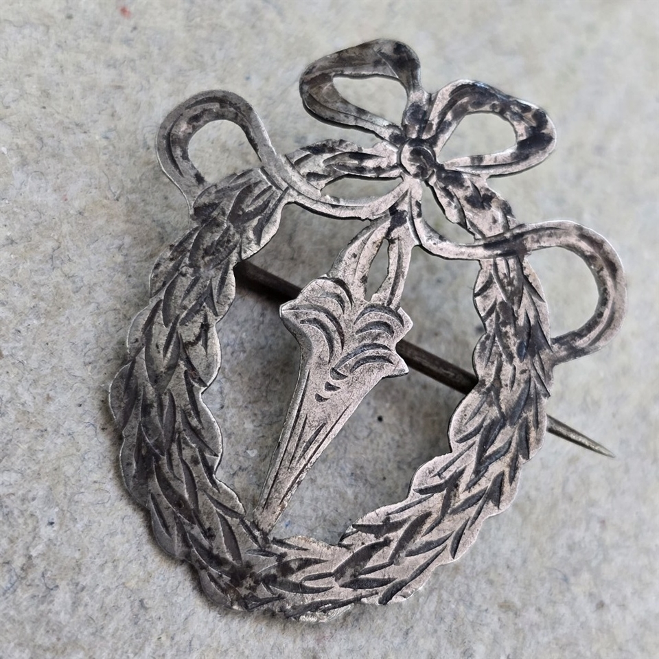 Brochen forestiller en fortryllende krans af laurbærblade, sirligt arrangeret i en sløjfe, der symboliserer sejr og ære.