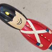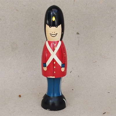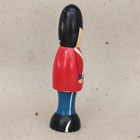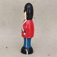 Med sin autentiske sort-bjørneskindshue, levende røde jakke og klassiske blå bukser, fanger denne figur essensen af traditionelt håndværk.