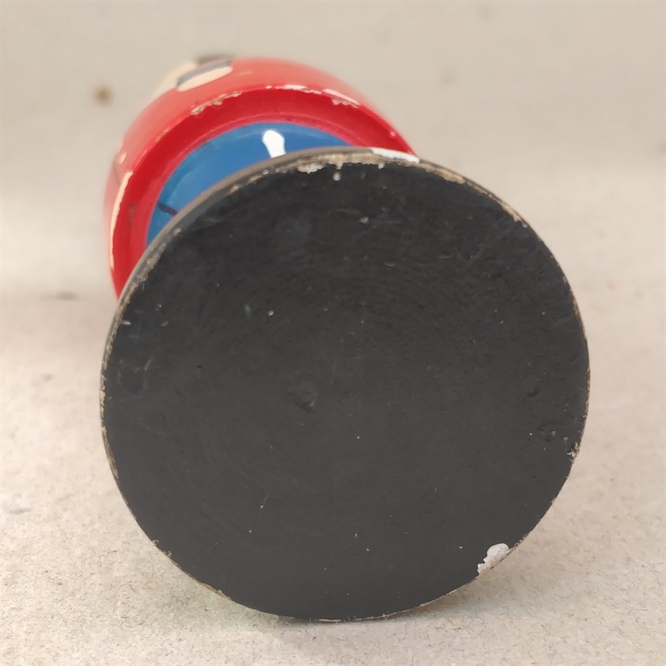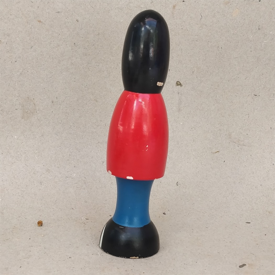 Denne nostalgiske træfigur, der står 15,5 cm. høj, er et unikt stykke gammelt legetøj, der tilfører et touch af historie og personlighed til ethvert rum.