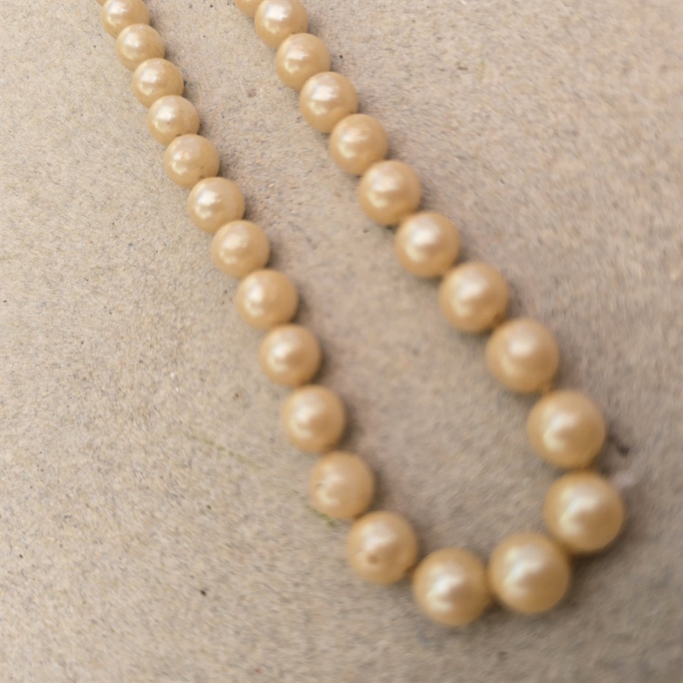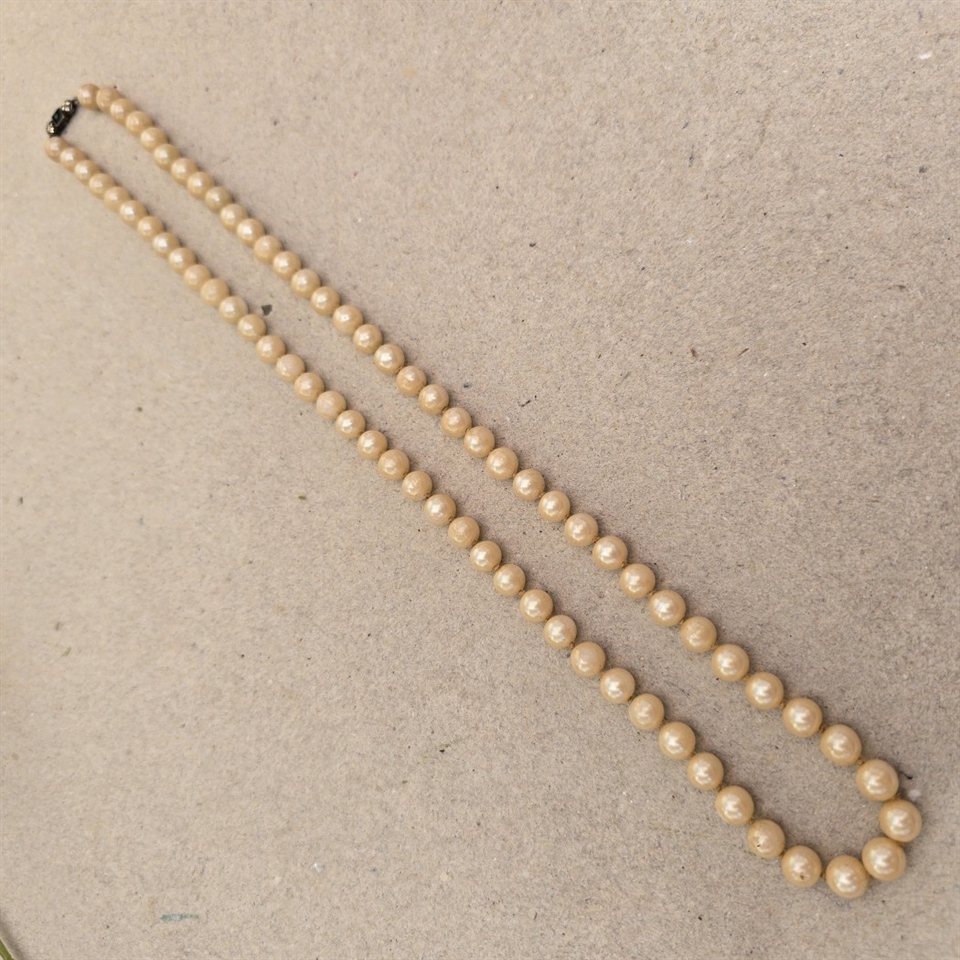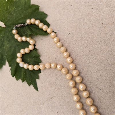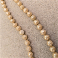 Kæden, der måler 60 cm. i længden, er omhyggeligt sammensat af ensartede cremefarvede glasperler, hver med en diameter på 6 mm., der tilføjer en subtil, men iøjnefaldende charme til ethvert outfit.