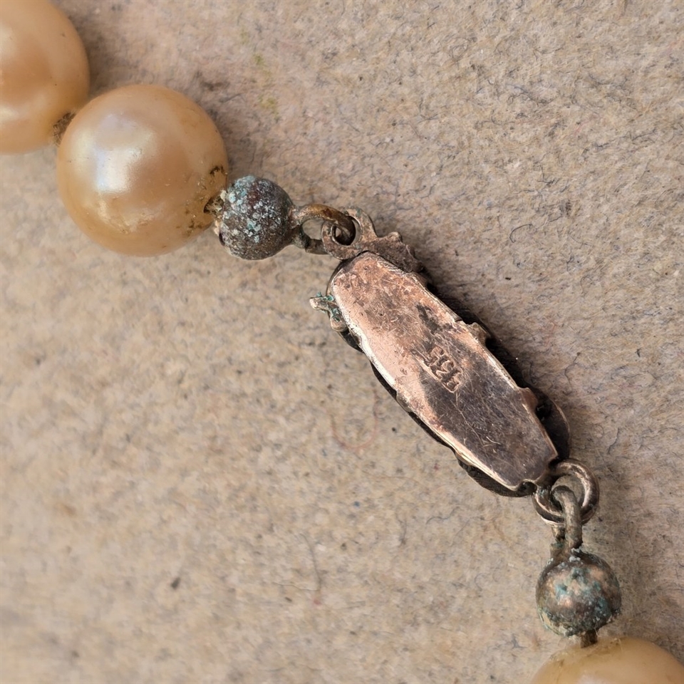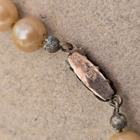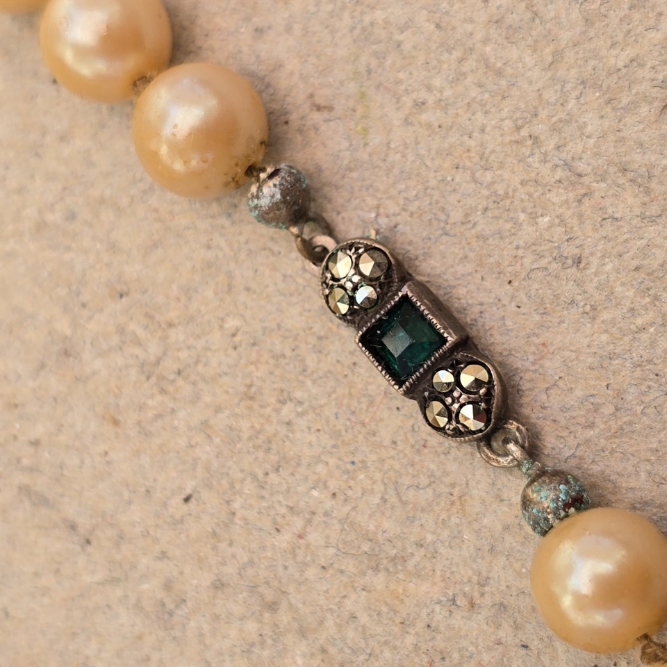 Opdag den tidløse elegance med "Glas perlekæde, ligeløb cremefarvede perler, sølvlås med grøn sten". Denne eksklusive og vintage halskæde er en sand repræsentation af klassisk skønhed og raffinement.