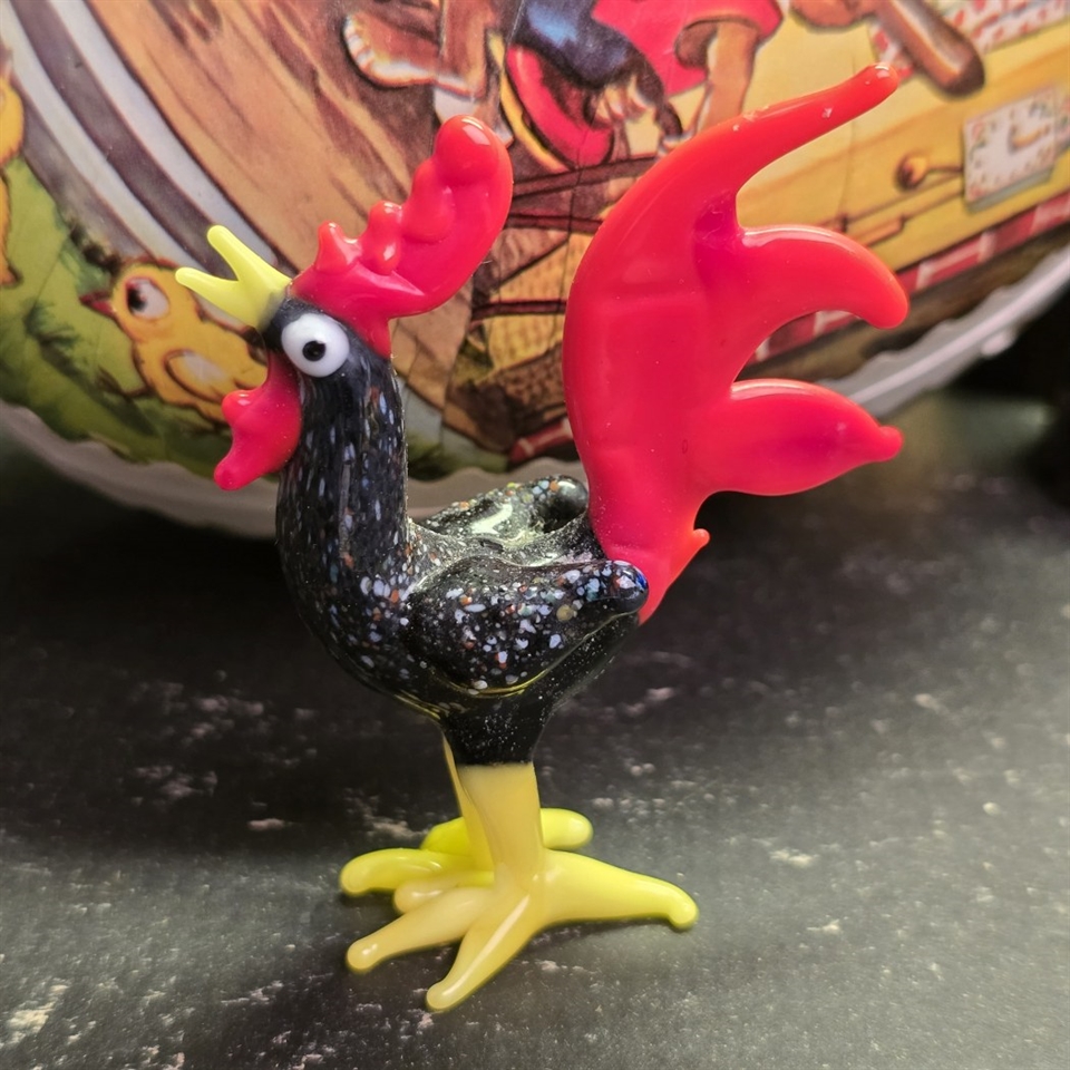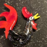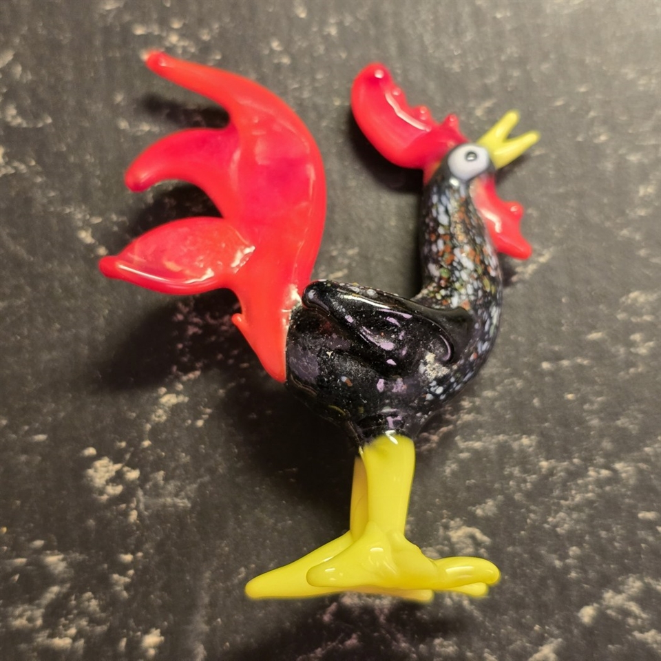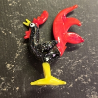 Fremstillet af sort glas med livlige detaljer, denne glashane prydes af en strålende rød halefjer og en majestætisk hanekam, der virkelig fanger øjet.