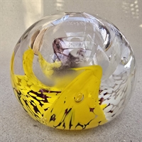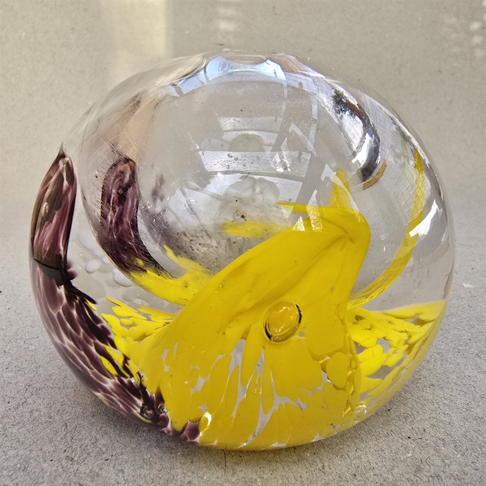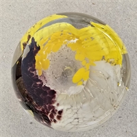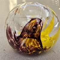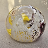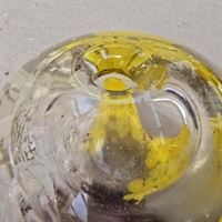 Med sin tiltalende kugleform og en varm blanding af gul, brun og klar glas, skaber denne vase en hyggelig og indbydende atmosfære i ethvert rum.
