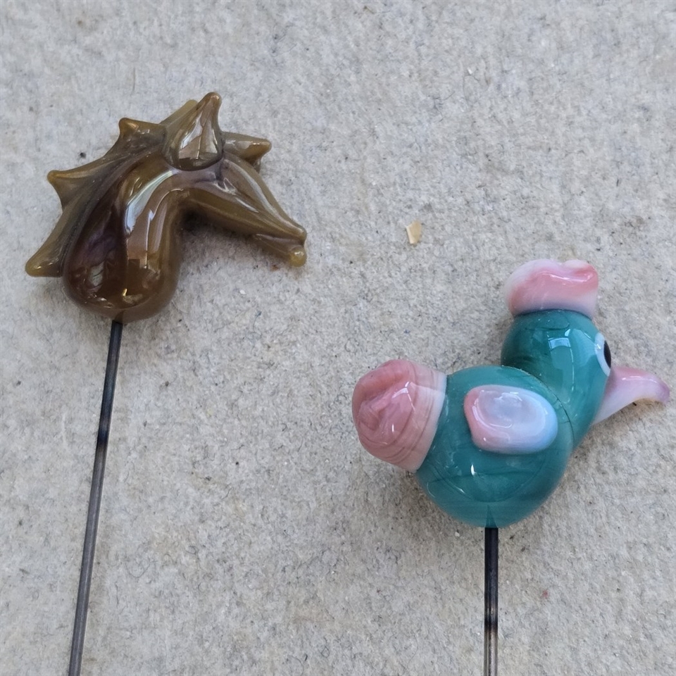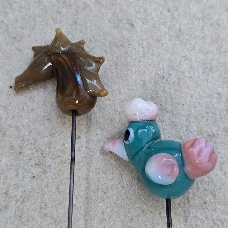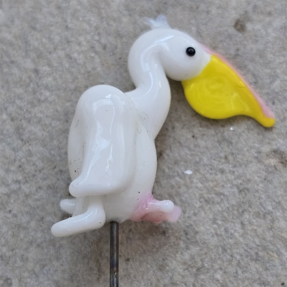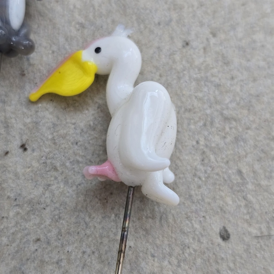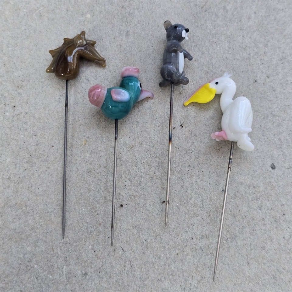 Dette sæt, "Gnaver, pelikan, søhest, pipfugl, gamle glas nipsenåle", indeholder fire smukt udførte nipsenåle, hver formet som en forskellig dyrefigur: en grå gnaver, en hvid pelikan, en brun søhest og en blå pipfugl. Hver nål er omhyggeligt lavet af glas og måler ca. 6,5 cm i længden.