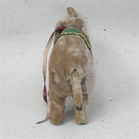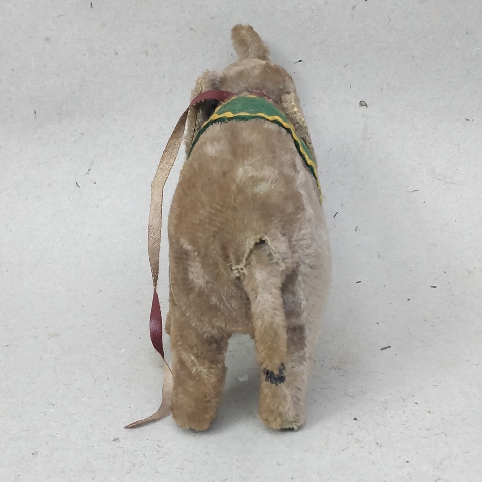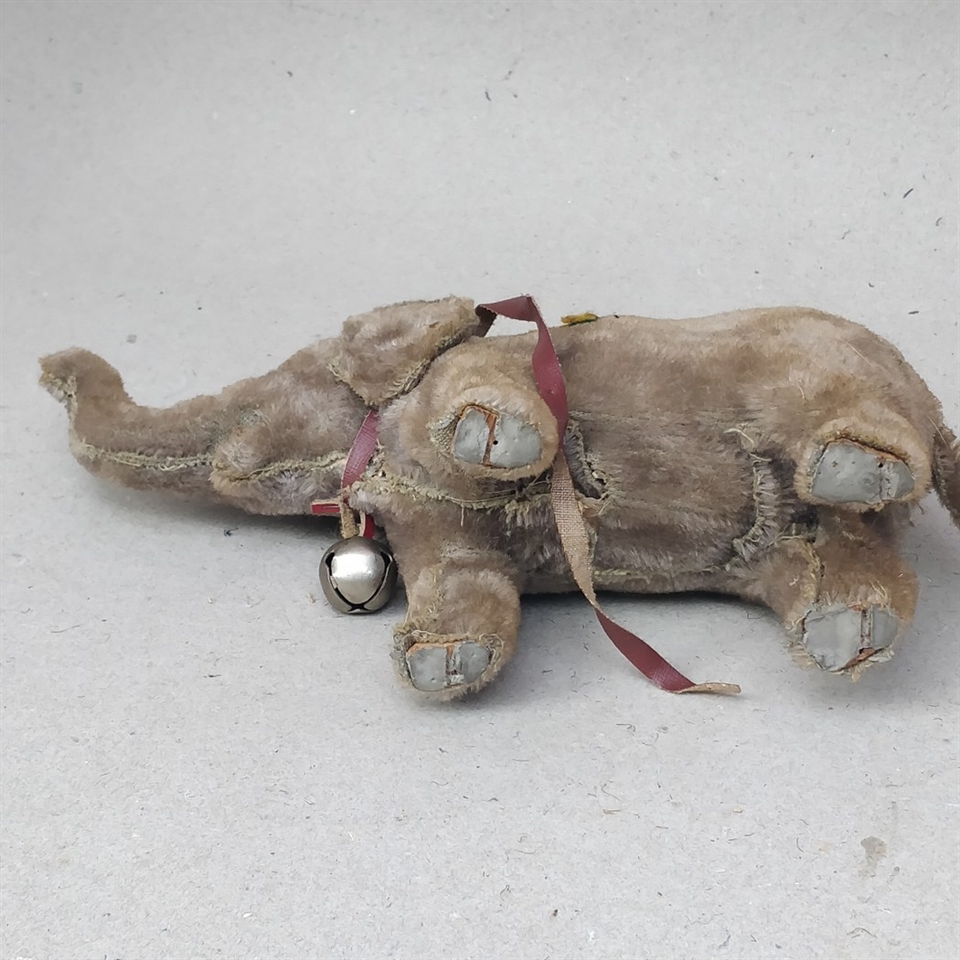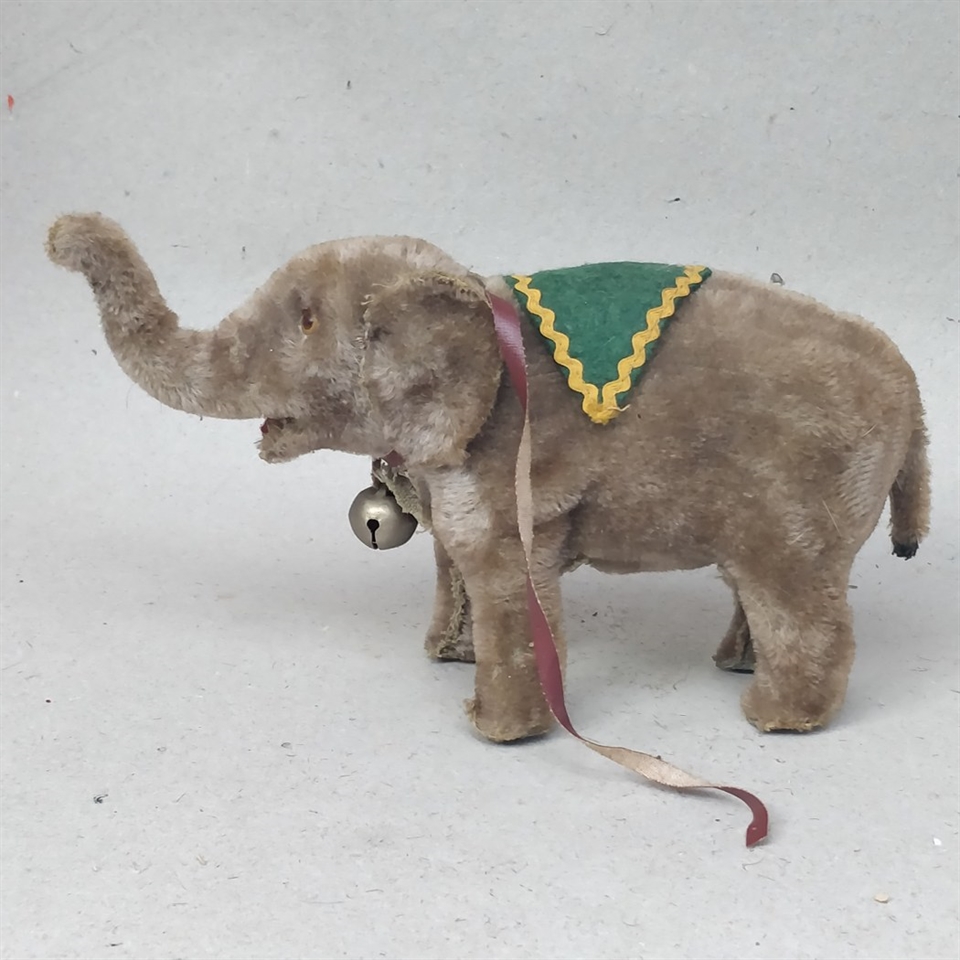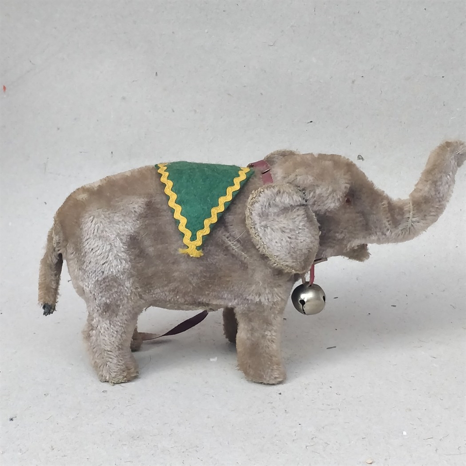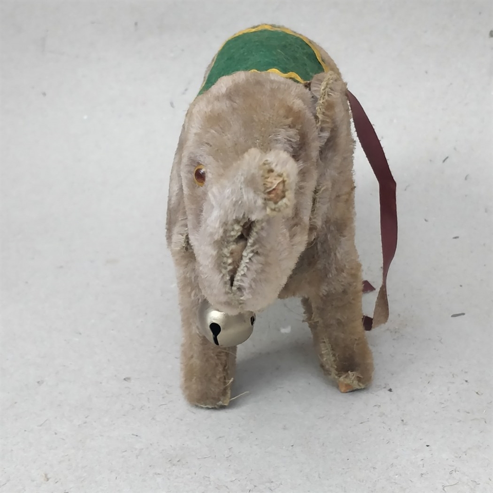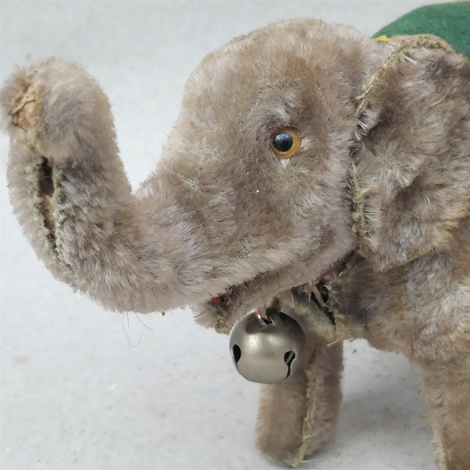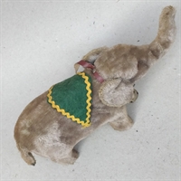 Opdag charmen ved vintage legetøj med denne bedårende 'Grå plys elefant med grønt dækken'.