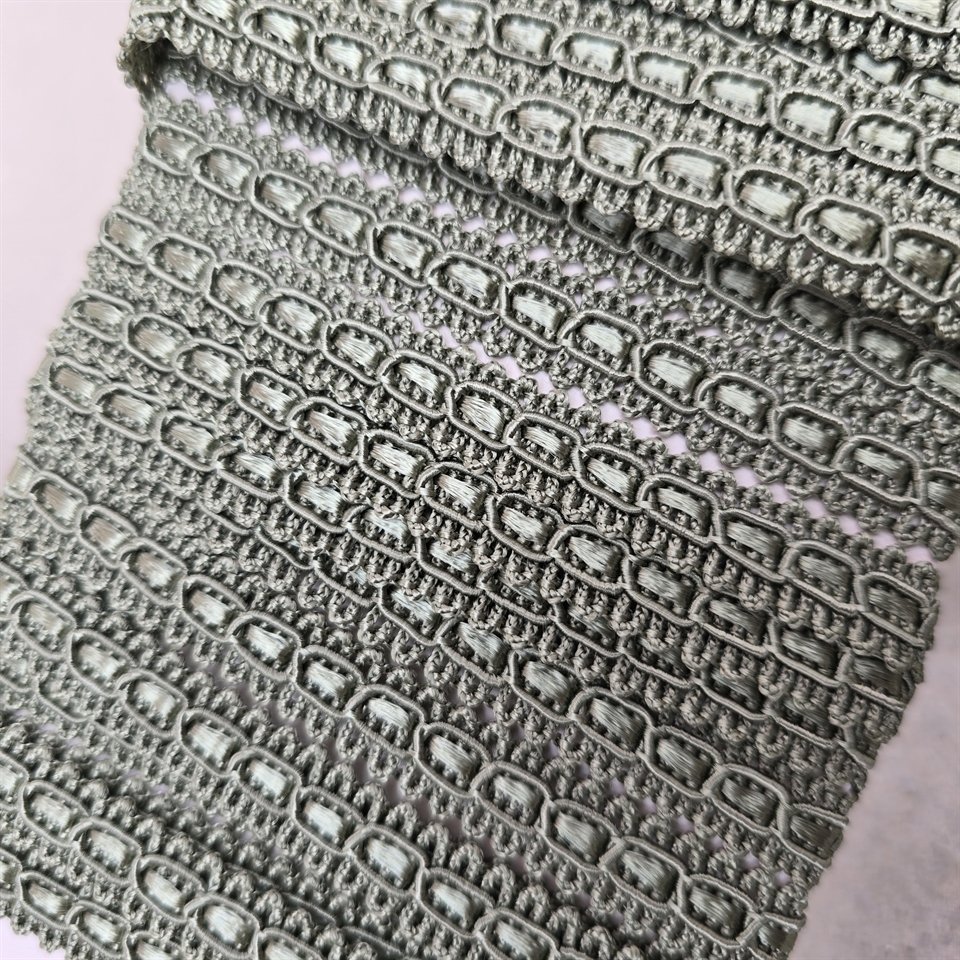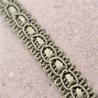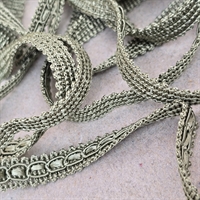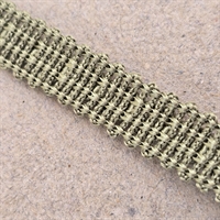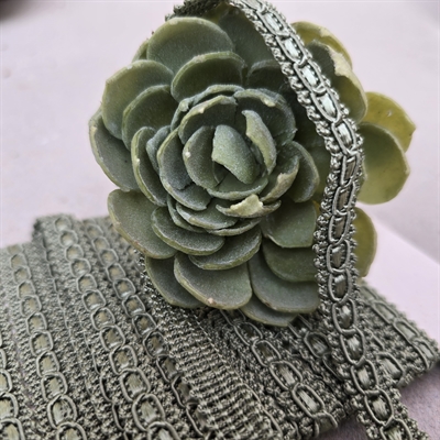 Dette smalle bånd, med en bredde på 10 mm., er udsmykket i en smuk grågrøn farve og prydet med et iøjnefaldende dekorations felt i midten, der tilfører en ekstra dimension af skønhed.