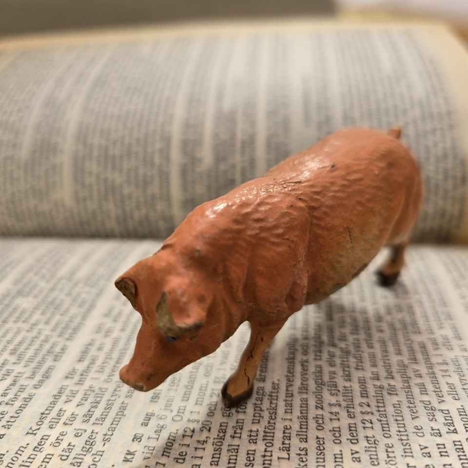 Dens autentiske grisefarve og de finurlige detaljer vil helt sikkert fange øjet, hvad enten den får en plads på hylden eller som en del af din vintage legetøjssamling.