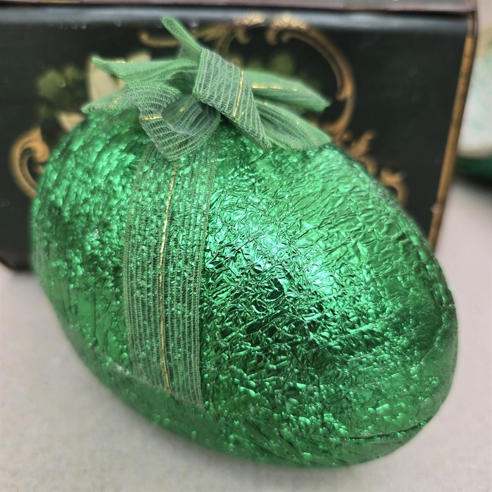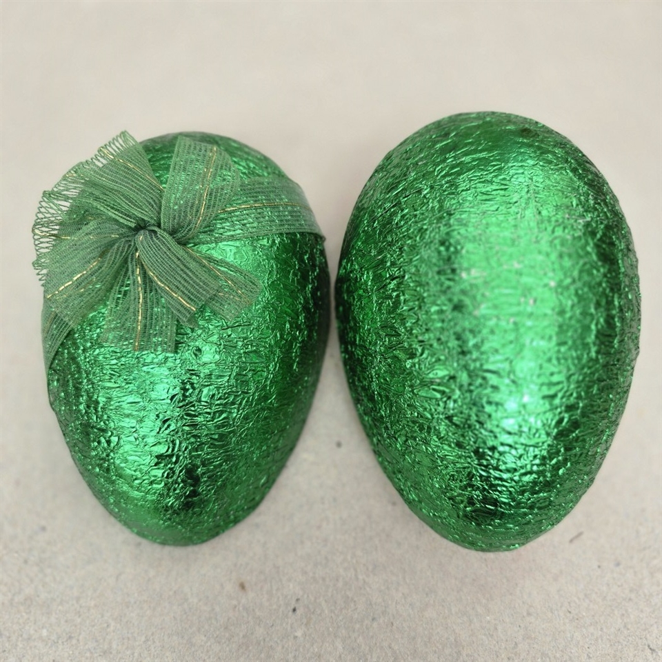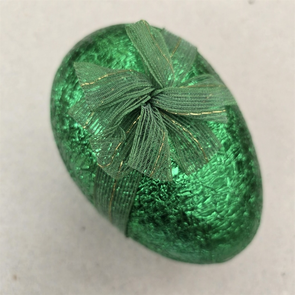 Ægget er omhyggeligt beklædt med skinnende grøn metalfolie, der fanger øjet med sit glitrende spil i lyset. Den dybe grønne farve symboliserer fornyelse og vækst, hvilket gør det til en perfekt dekoration til at fejre forårets ankomst og påskehøjtiden.