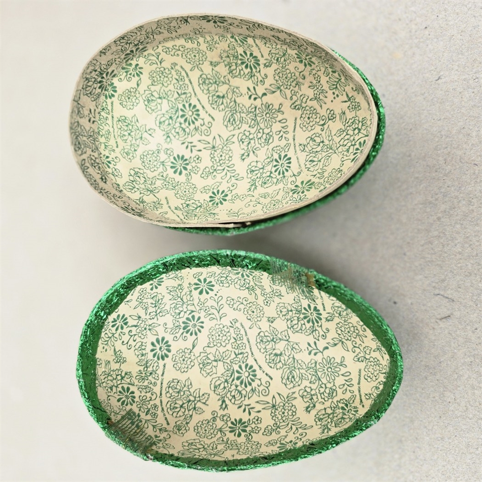 Opdag charmen af historiske påskefester med dette enestående 'Grønt metalfolie beklædt gammelt påskeæg. GDR'. Dette iøjnefaldende påskeæg, der står 15 cm. højt, er et ægte stykke af historisk påskepynt, der vil tilføre et strejf af vintage glamour til din højtidelige dekoration.