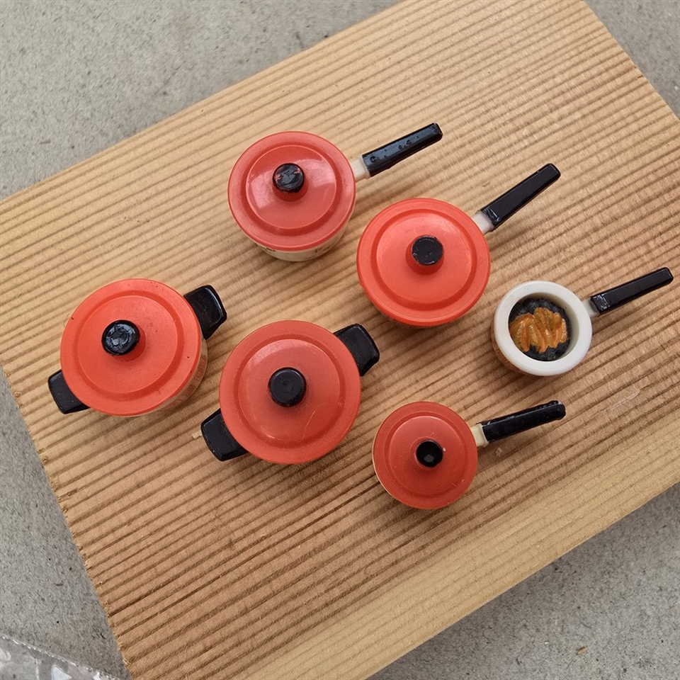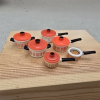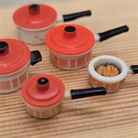 Dette unikke sæt består af smukt orange-farvede gryder og kasseroller, der vil bringe et strejf af retro charme til ethvert dukkehuskøkken.