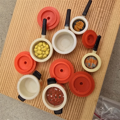 Den største kasserolle måler 3,3 cm. i længden, hvilket gør den ideel til dukkehusets komfur eller ovn.
