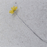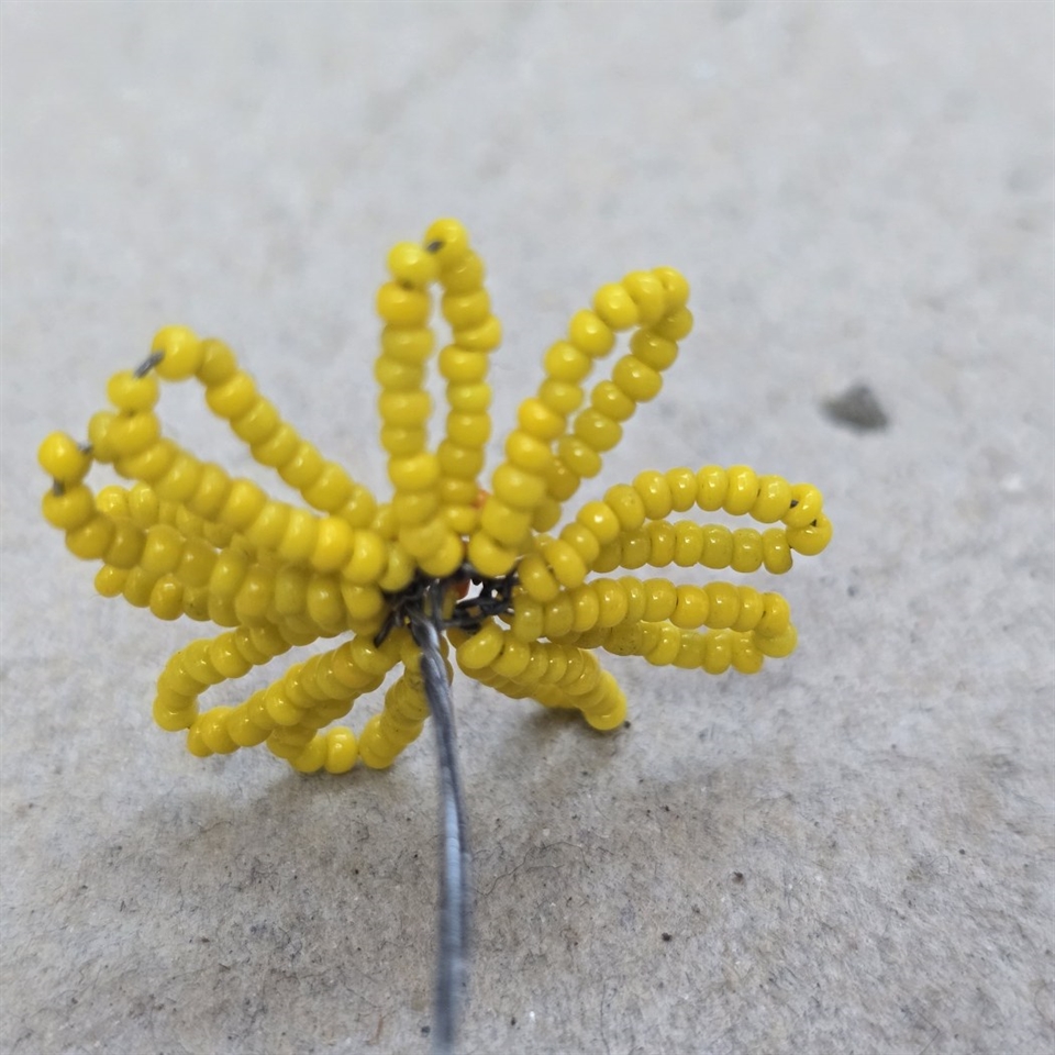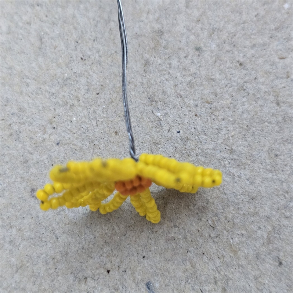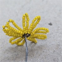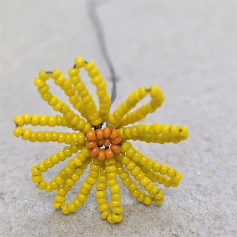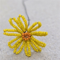 Denne fortryllende blomst er omhyggeligt håndlavet med strålende gule glasperler, som er anbragt på en solid ståltråd, sikrende både holdbarhed og skønhed. Med sin iøjnefaldende orange midte og en diameter på 3 cm., er hver blomst en lille kunstværk.
