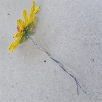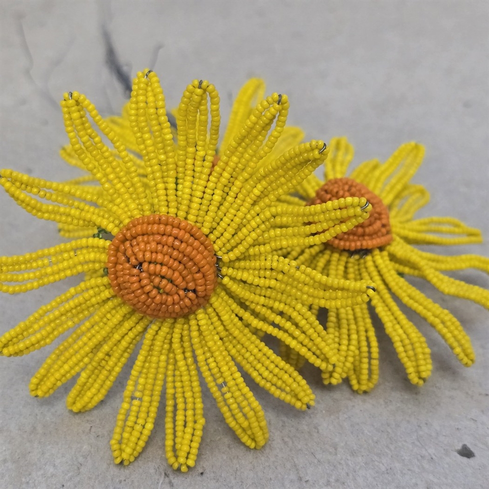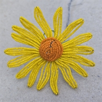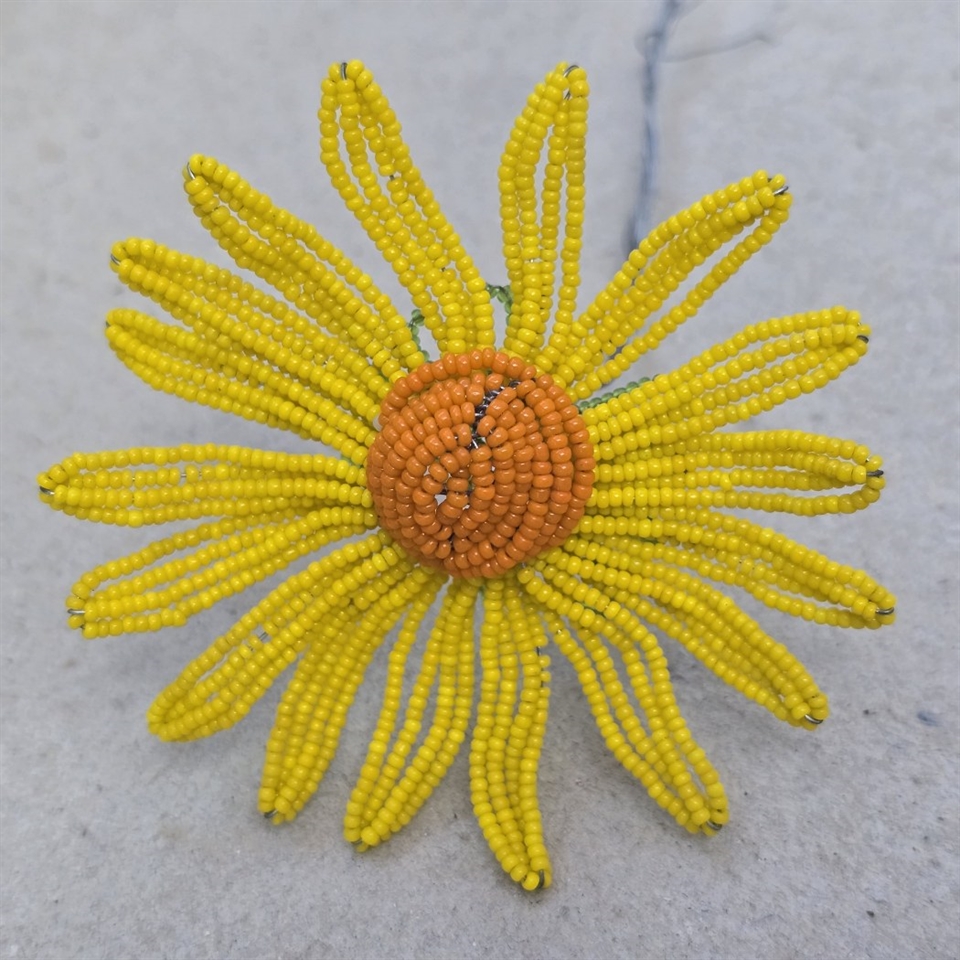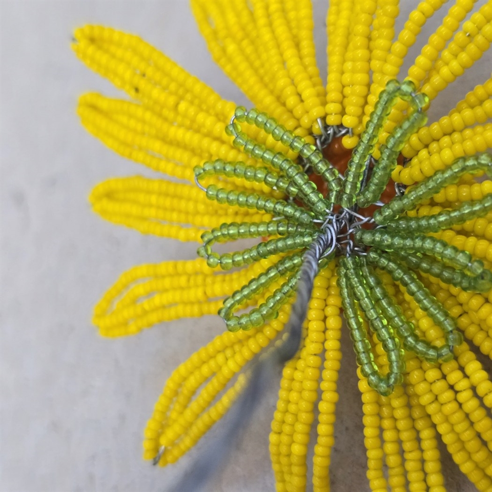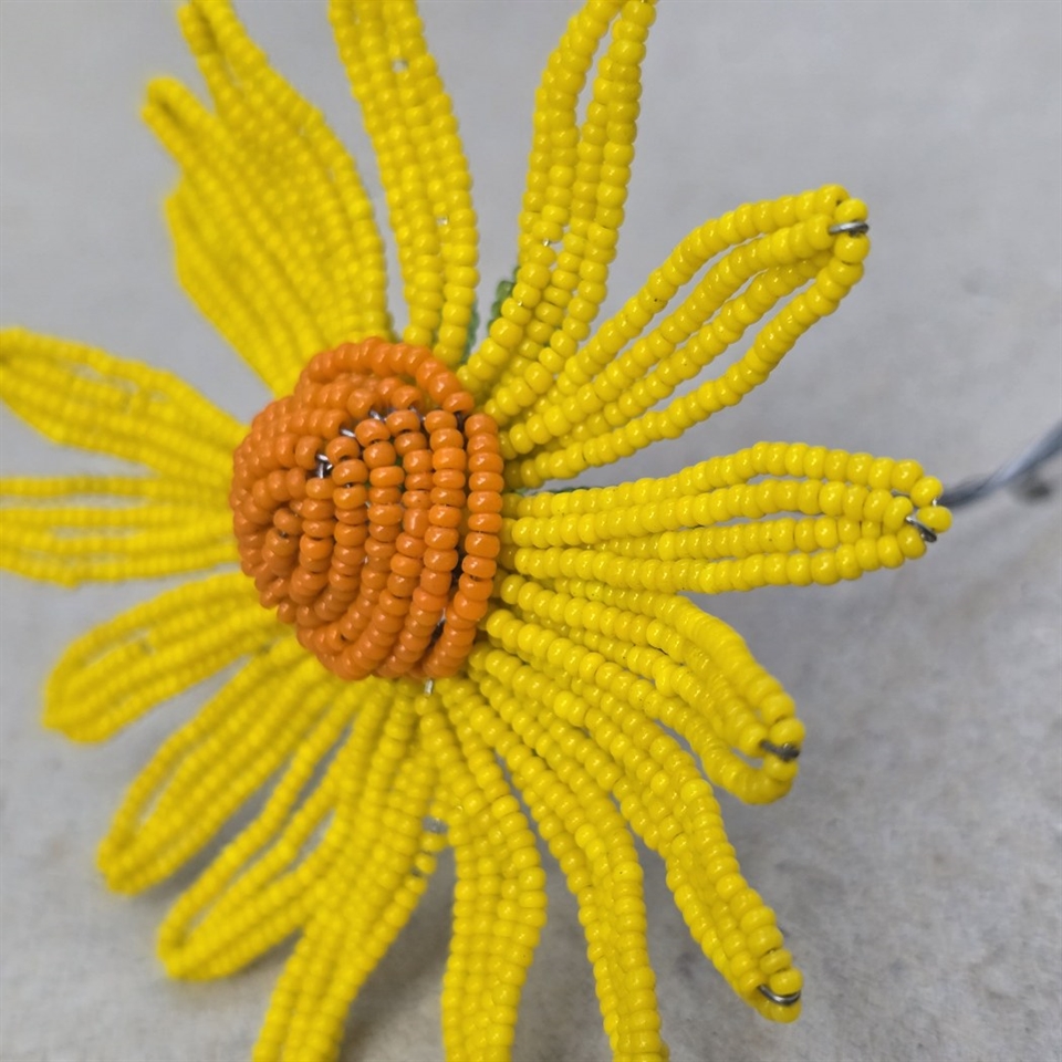 Denne unikke blomst er omhyggeligt skabt med lyse gule glasperler og prydet med en iøjnefaldende orange midte, der tilføjer et strejf af varme og elegance til ethvert rum.