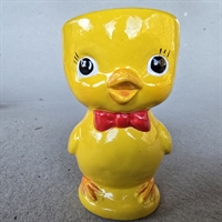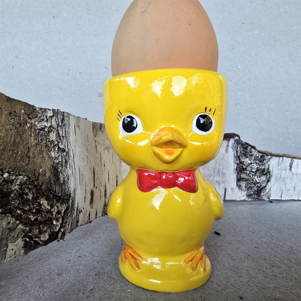 Produktet er fremstillet af porcelæn og præsenterer en livlig gul kylling iført en iøjnefaldende rød butterfly, hvilket tilføjer et sjovt og festligt element til dit morgenbord.