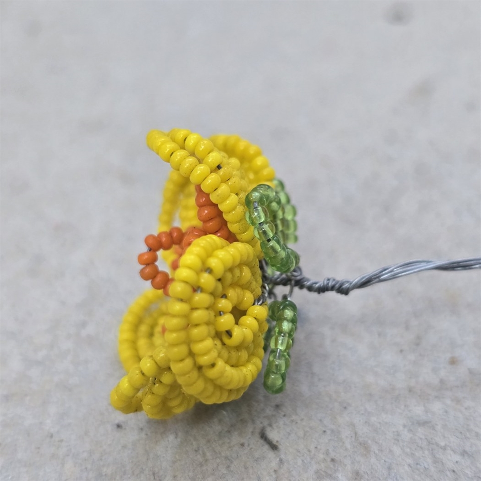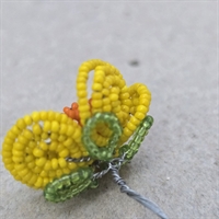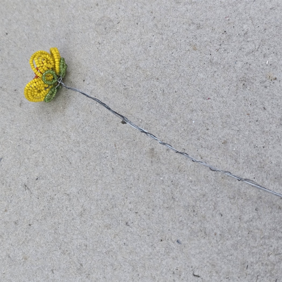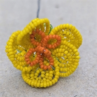 Opdag skønheden i vores eksklusive 'Gul, orange vintage perleblomst fra Frankrig' – et sandt mesterværk til din dekorationssamling! Denne charmerende perleblomst er omhyggeligt udformet med en krop i en strålende gul nuance, fremhævet af en levende orange midte og en delikat grøn bund, der tilføjer et frisk pust af natur.