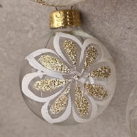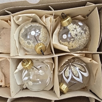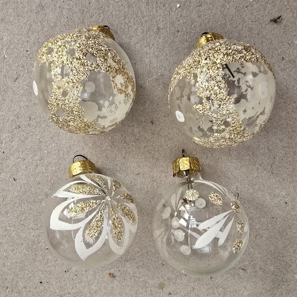 Opgrader dit juletræ med et strejf af nostalgi og elegance med vores sæt af 4 "Guld, hvide dekorerede klare glas juletræskugler, retro".