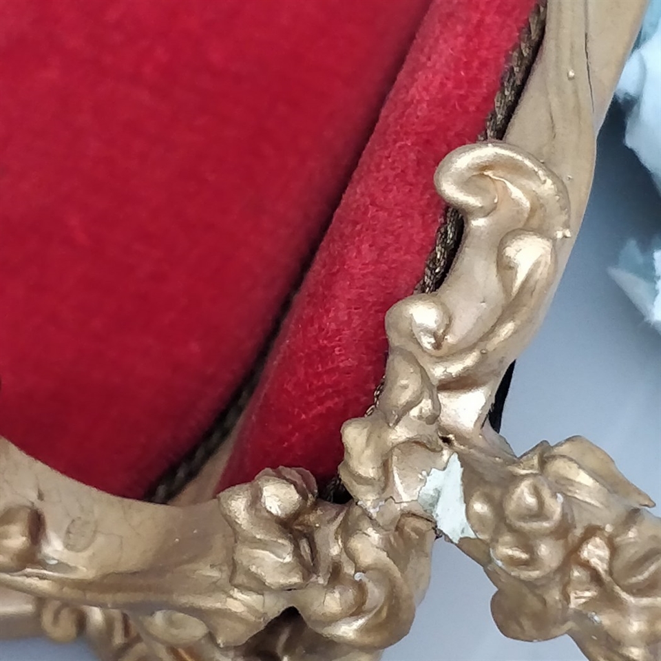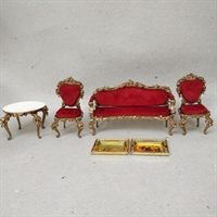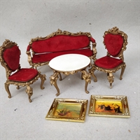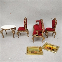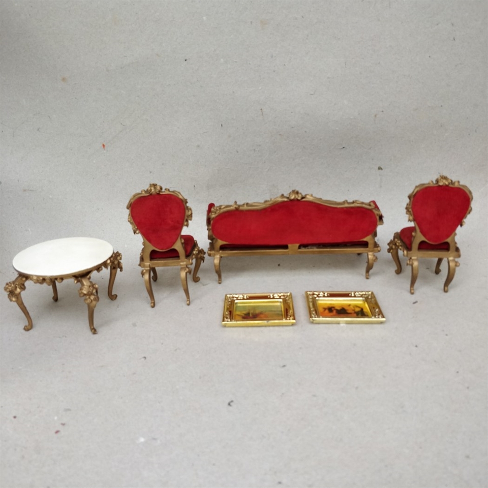 Opdag den elegante charme og detaljerigdom med sættet 'Guldfarvet gammelt dukkehus møblement, Rudolf Szalast. 6 dele'.