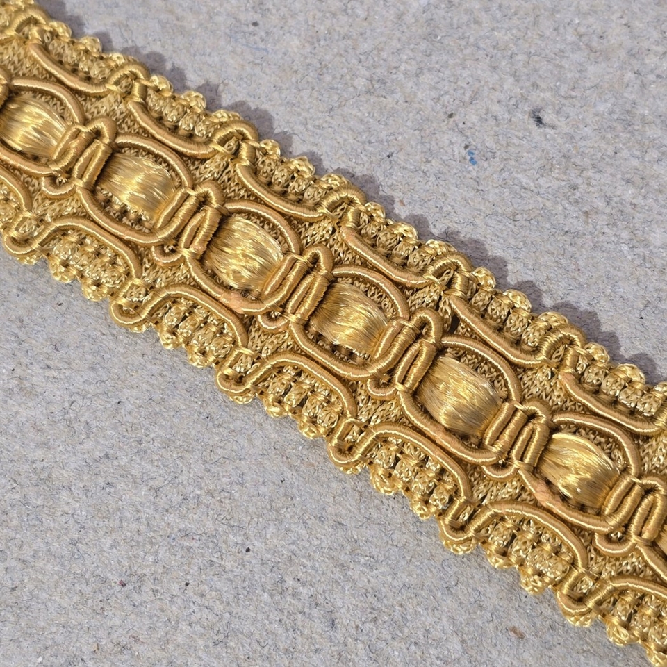 Vævet af dygtige italienske kunsthåndværkere, reflekterer dette guldfarvede bånd en æra af overdådighed og luksuriøs dekor. Det er ideelt til at fremhæve detaljerne på dine mest eksklusive projekter – fra haute couture beklædning til sofistikerede hjemmeinteriører og alt derimellem.