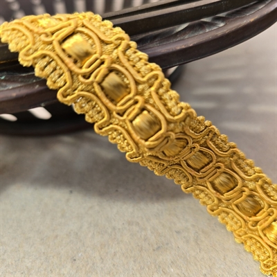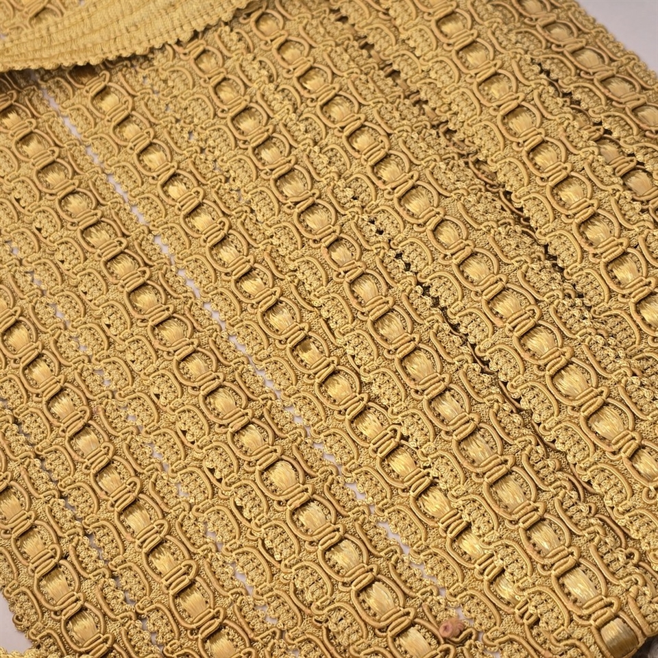 Gør dit næste projekt uforglemmeligt med vores "Guldfarvet gammelt possementbånd til dekoration" – hvor tradition møder luksus.