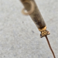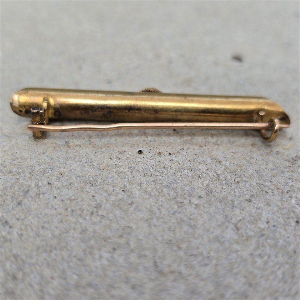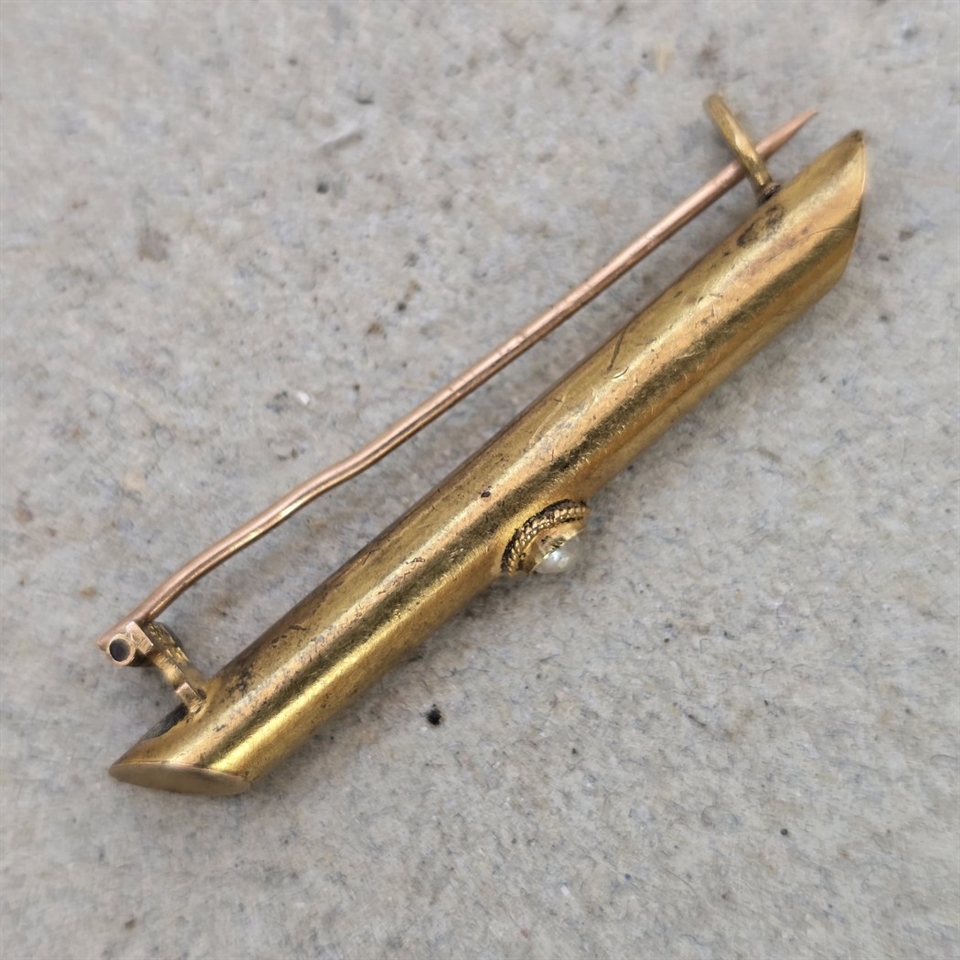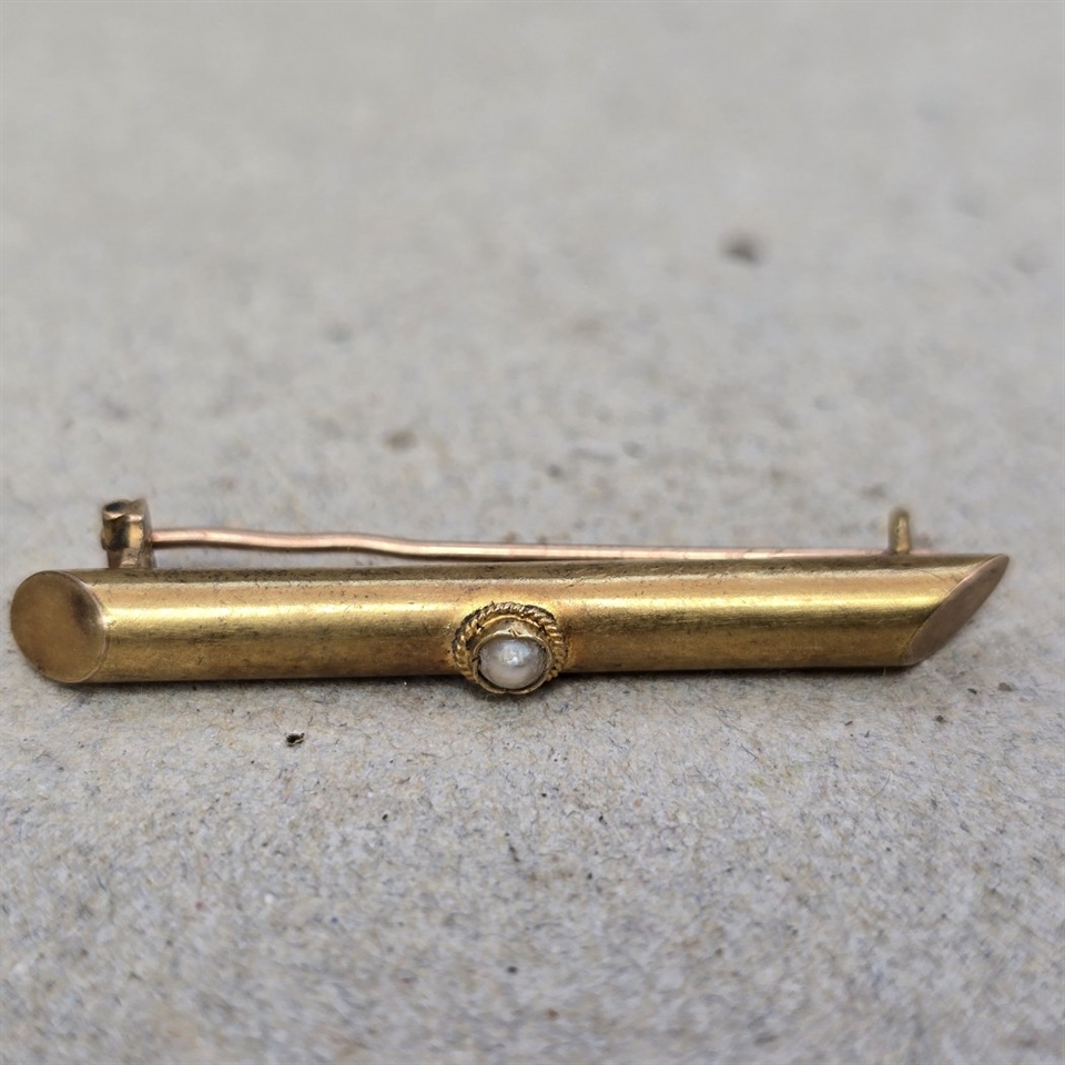 Oplev elegance og vintage charme med vores eksklusive 'Guldfarvet nål, rør med perle i, vintage broche'. Dette er et sandt mesterværk af tidløs skønhed, omhyggeligt designet for at tilføje et strejf af luksus og raffinement til enhver garderobe.