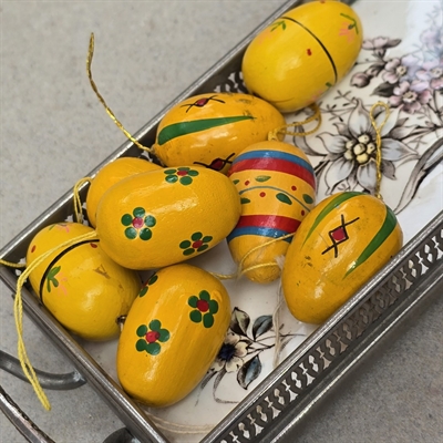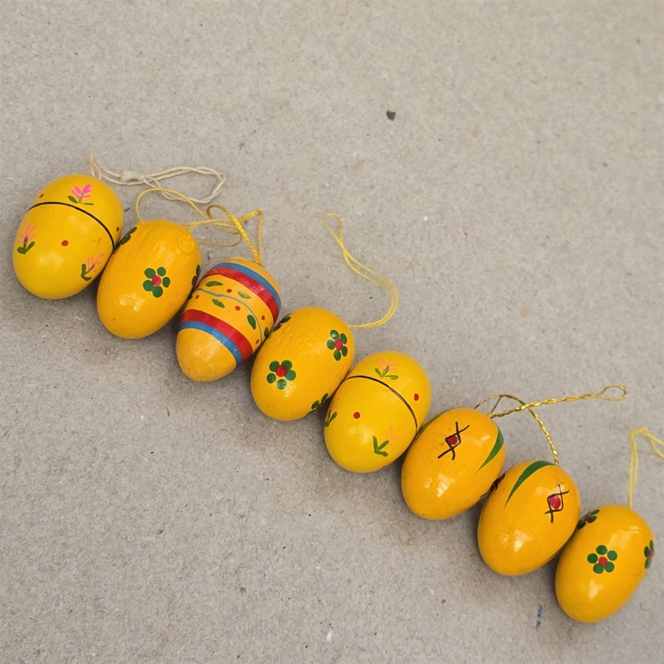 Opdag nostalgien og charmen ved påsken med vores eksklusive sæt af 8 'Gule dekorerede træ æg, gammel påskepynt'.