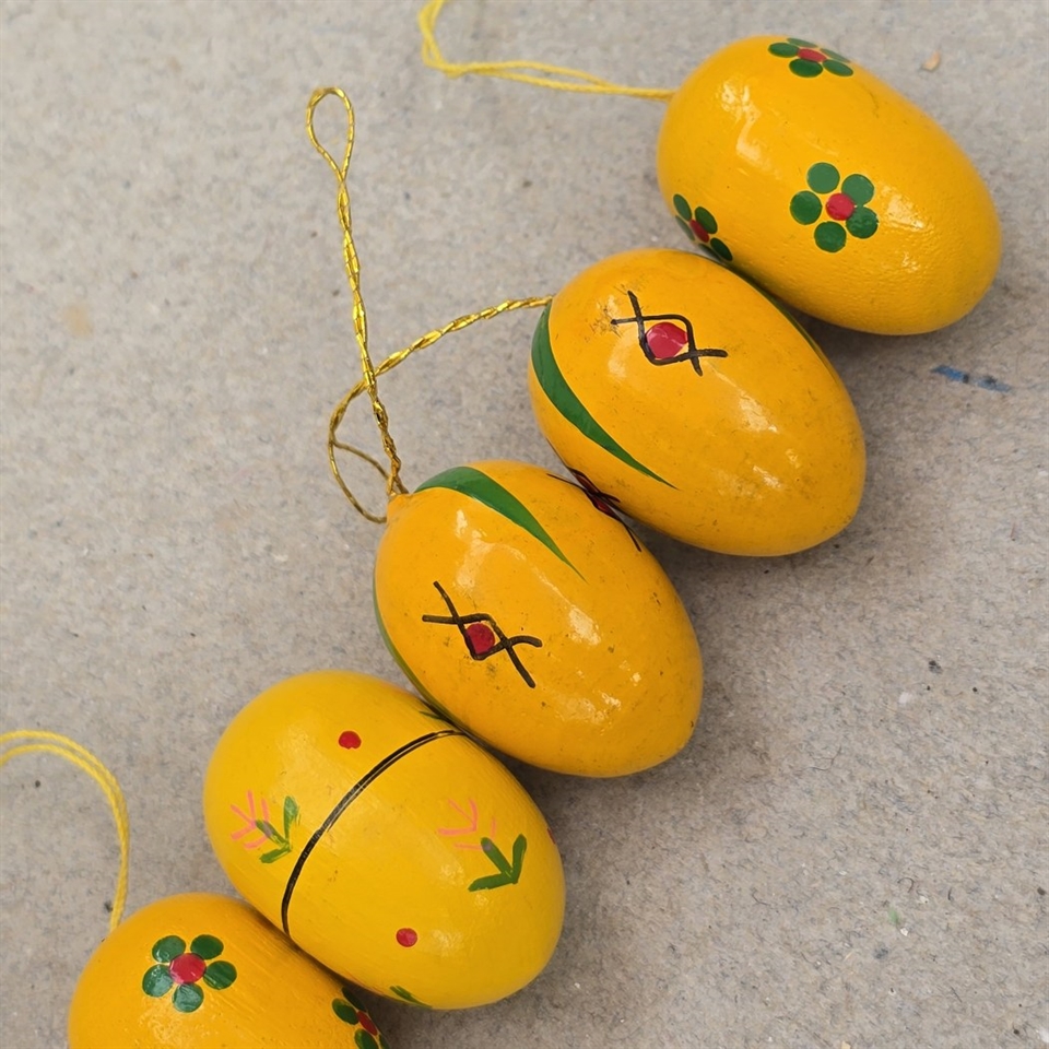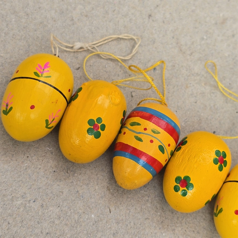 Bemærk: Selvom ét af æggene mangler ophæng, tilføjer dette blot til deres autentiske vintage charme, perfekt for samlere eller som en særlig dekoration i dit hjem.
