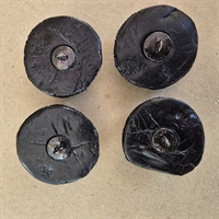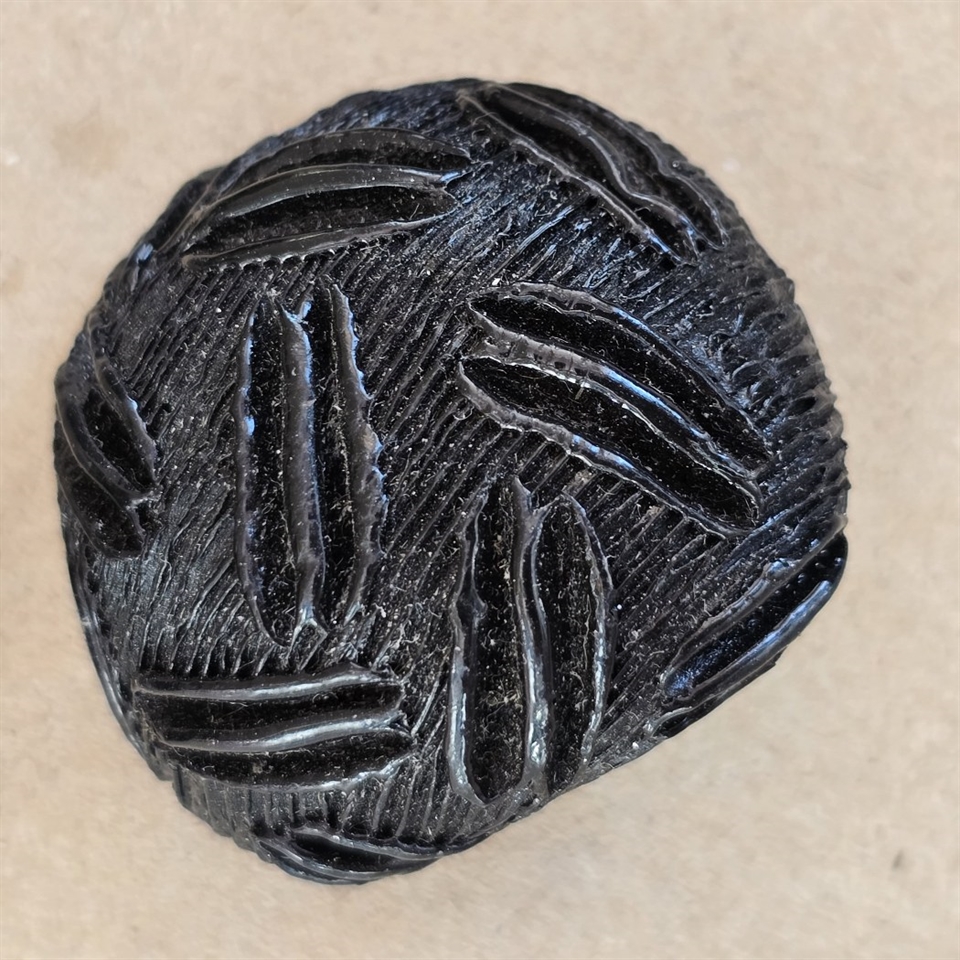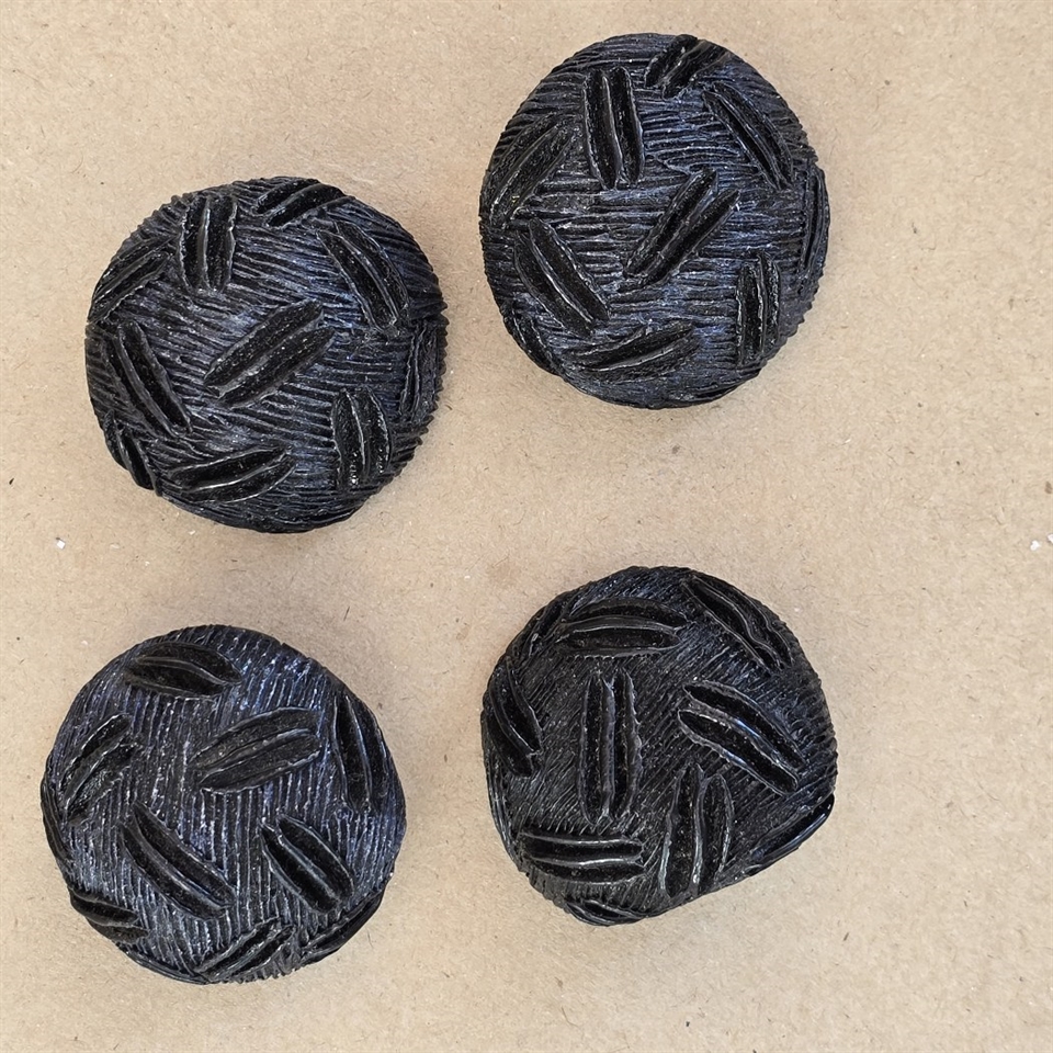 Hver knap er omhyggeligt håndlavet og prydet med et iøjnefaldende sort stribet mønster, hvilket giver dem et distinkt og sofistikeret udseende.